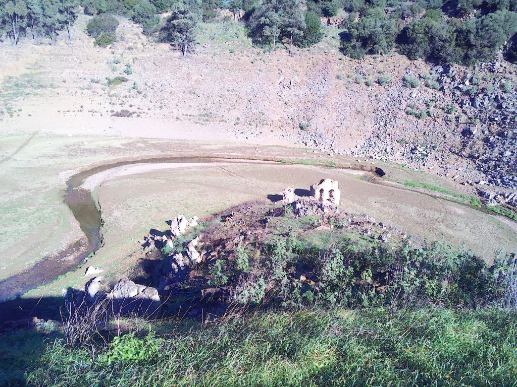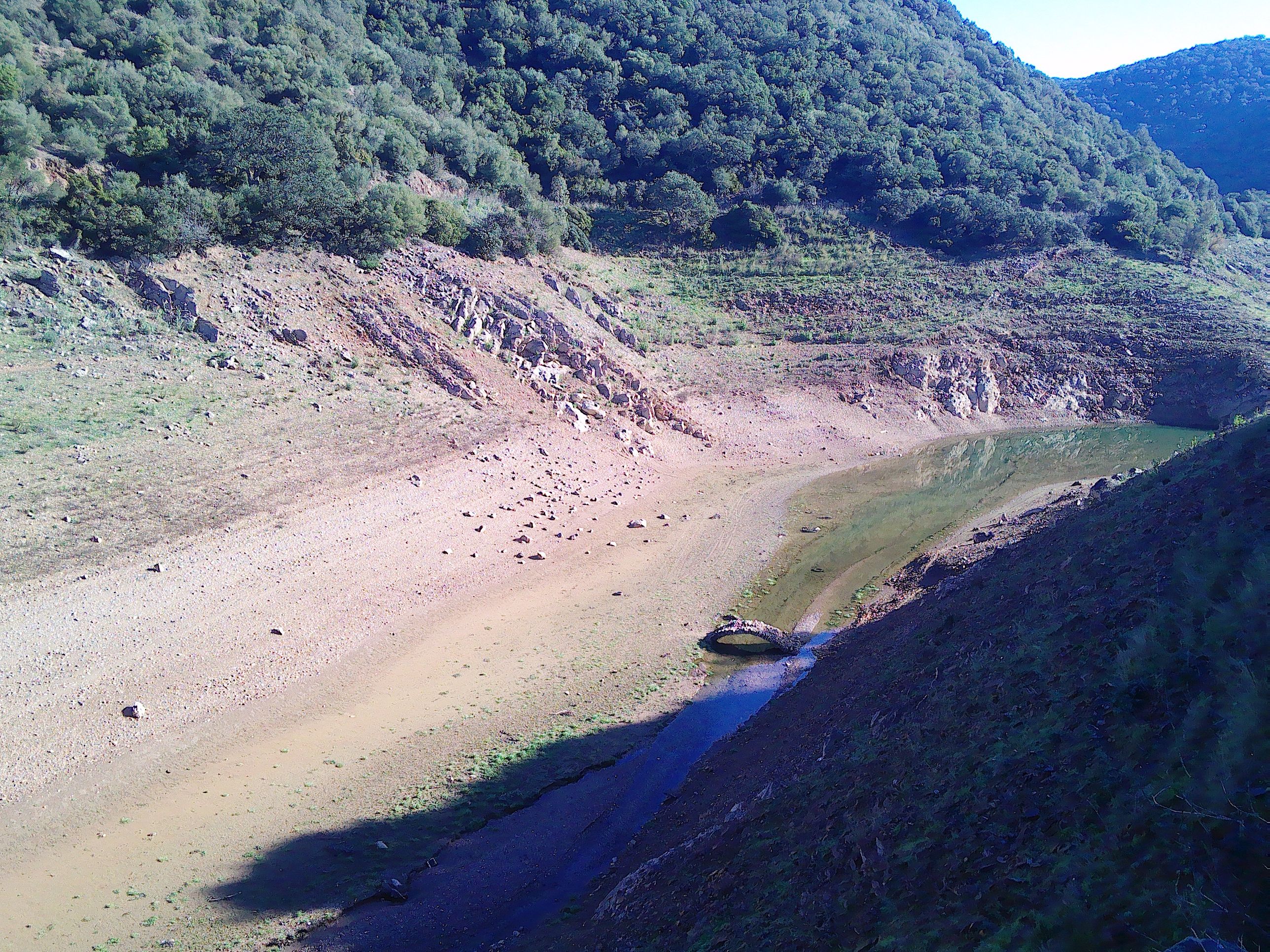Vor dem Besuch von Iglesias fuhren wir noch zum Stausee Lago Corsi, besser gesagt, ehemaligen Stausee. Den größten Teil des Stausees kann man erwandern, denn es kommt nicht mehr genug Wasser nach. Unterhalb der neuen Straßenbrücke stehen Ruinen eines Gebäudes am Grund des See´s, die bis vor einer Weile noch überflutet waren. Weiter rechts überspannt noch eine uralte kleine Bogenbrücke den Bach. Sie ist gerade so breit wie der Bach. Das heißt also, es ist alles wieder wie vor dem Füllen des Stausees. Diese Überreste vergangener Zeiten machen den Stausee besonders. Er liegt auf gut 300 Metern Höhe und es hat hier über Nacht gefroren.