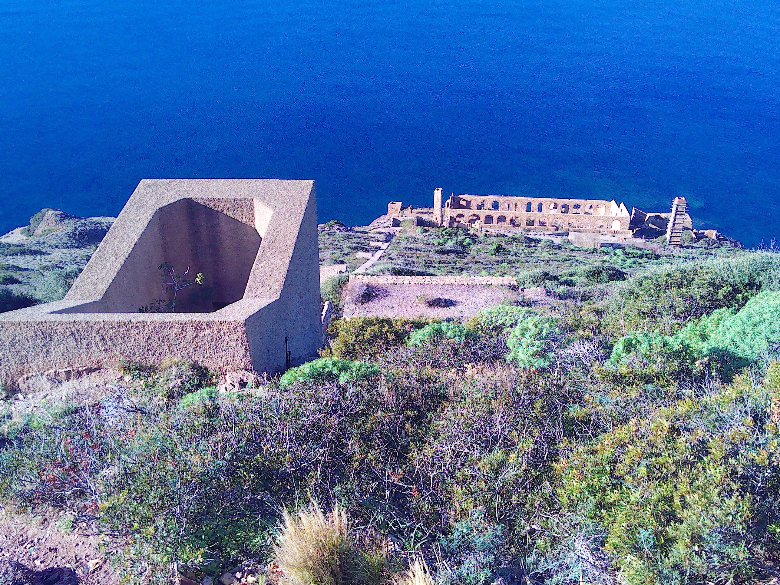 Auf dem wunderschönen Panoramaweg „Belvedere“, der um einen Felsen herum führt und hier und da als Garten gestaltet wurde, sieht man die Reste einer Mineralienwäscherei. Das große Gebäude tief unten am Fels wurde terrassenförmig angelegt, was man jedoch nur aus einiger Entfernung vom Fontanamare-Strand aus sehen kann. Was man von oben sieht ist aber nicht weniger spektakulär. Über eine Fördereinrichtung transportierte man die Mineralien nach oben. Auch davon sind noch Reste zu besichtigen. Bis vor Kurzem konnte man noch eine sehr lange Treppe nach unten steigen, die jedoch inzwischen kaputt und gesperrt ist.