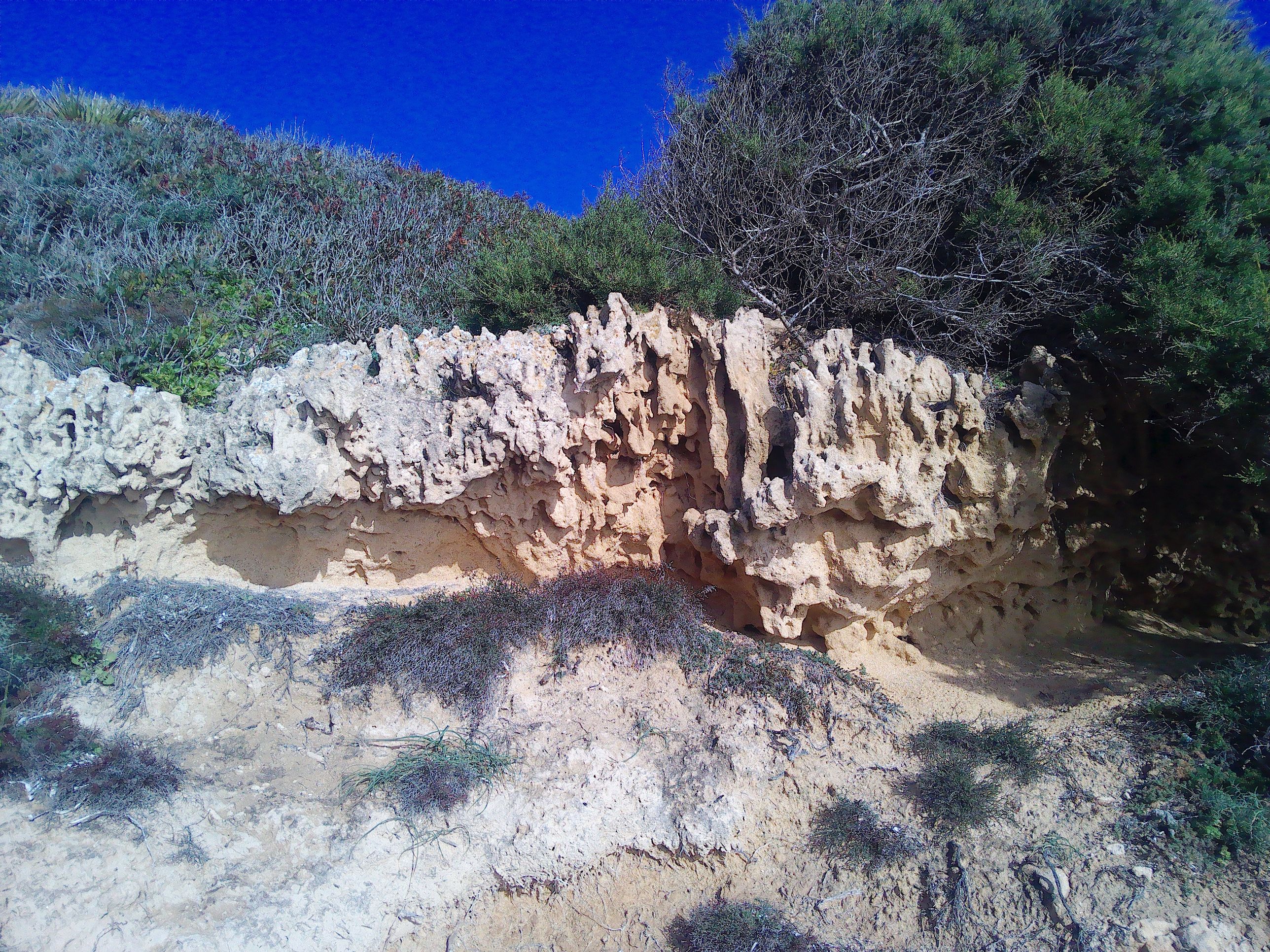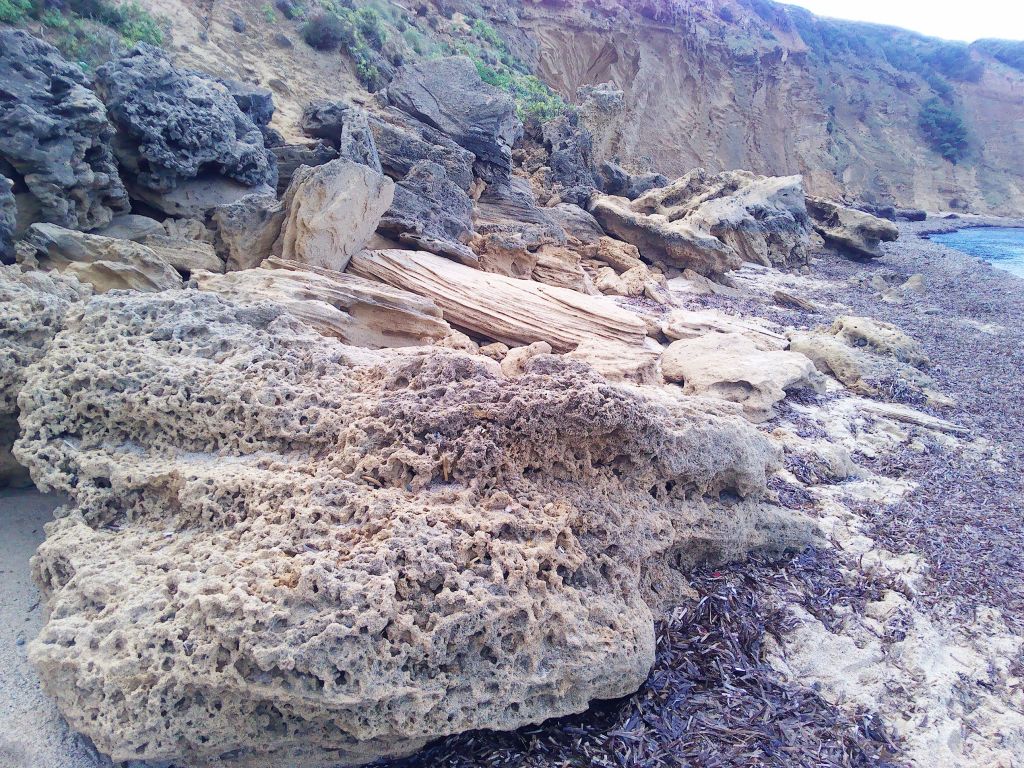 Ein steiler Weg führt von der Siedlung nach unten an den Strand. Wenn man sich links hält fasziniert eine Steilküste aus Sandstein. Leider liegt sie fast immer von der Sonne abgewendet und ist daher sehr dunkel. Viele Felsbrocken sind aus der Wand gebrochen und liegen verstreut am Strand. Sie besitzen wunderschöne Formen. Sogar offenliegende Tropfsteine sind an ihnen und auch noch an der Wand zu finden. Wo hat man schon so etwas? Allein schon das lohnt den Weg nach unten, und auch wieder nach oben.