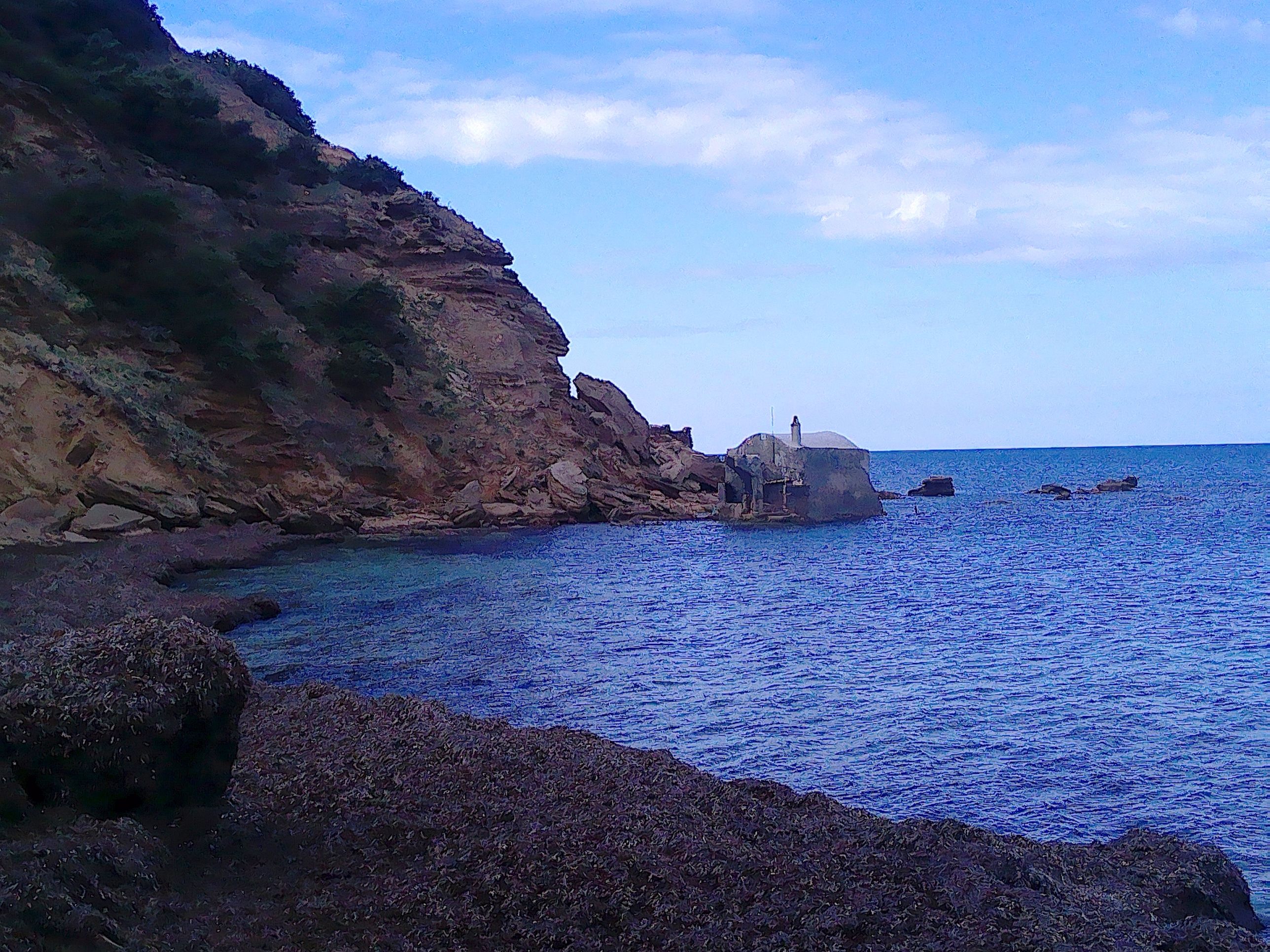 Am Ende dieser Wand steht ein kleines Fischerhaus. Inzwischen ist es verlassen, denn das Wasser hat sich das Grundstück geholt. Leider kamen wir nicht nah genug heran, weil der ganze Strand voller Felsbrocken liegt und der Rest mit Unmengen von totem Seegras bedeckt ist. Da sieht man nicht wohin man tritt. Trotzdem war der Besuch ganz schön.