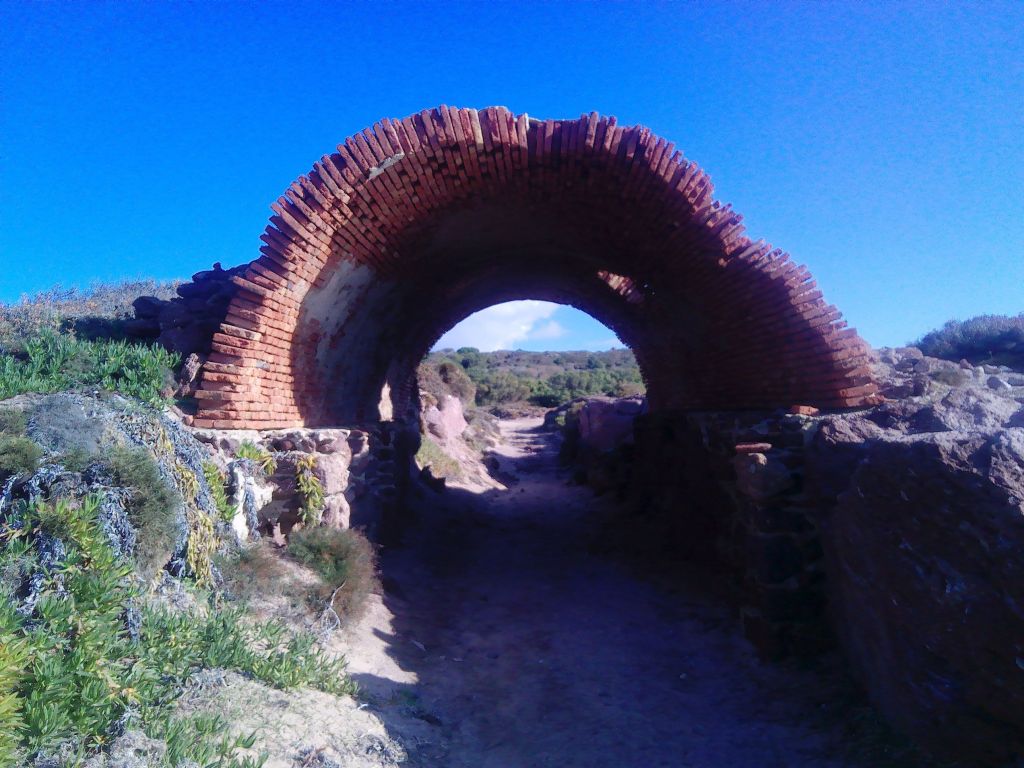 Fontanamare am nördlichen Strandende war einmal eine Bergarbeitersiedlung. Die wenigen Häuser sind inzwischen verfallen, nur zwei wurden wieder aufgebaut. In einem davon hat sich eine Pizzeria angesiedelt. Auf der anderen Straßenseite zieht sich eine merkwürdige Konstruktion aus Stein den Hang hinauf. Auf der Kuppe des Hügels steht eine Art schmaler Turm, zu 2/3 eingefallen. Von ihm aus führt ein mannshoher Tunnel bis zur Straße hinunter. War das einmal eine Wasserleitung? Was war das für ein Turm mitten auf der Hügelspitze. Leider kann ich dazu keine Angaben finden. Es bleibt mysteriös.