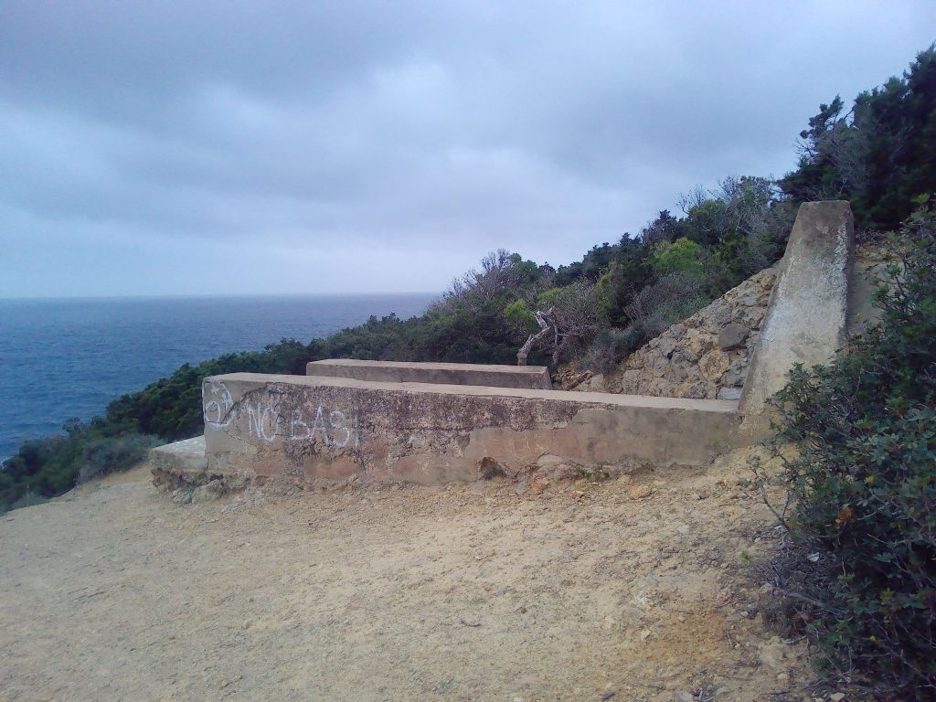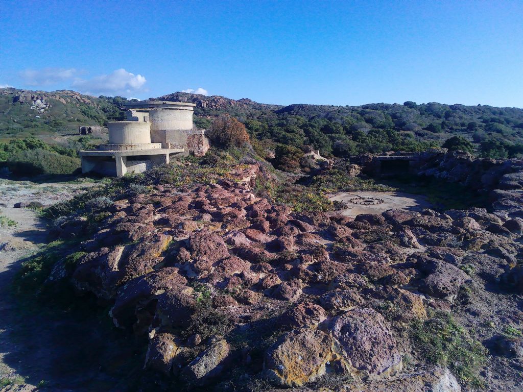 In Sichtweite liegt eine Küstenbatterie aus dem 2. Weltkrieg, mit einem Kommandoturm, mehreren Geschützstellungen und einem Haus etwas entfernt. Von hier aus kann man zurück nach Nebida und Porto Flavia sehen.