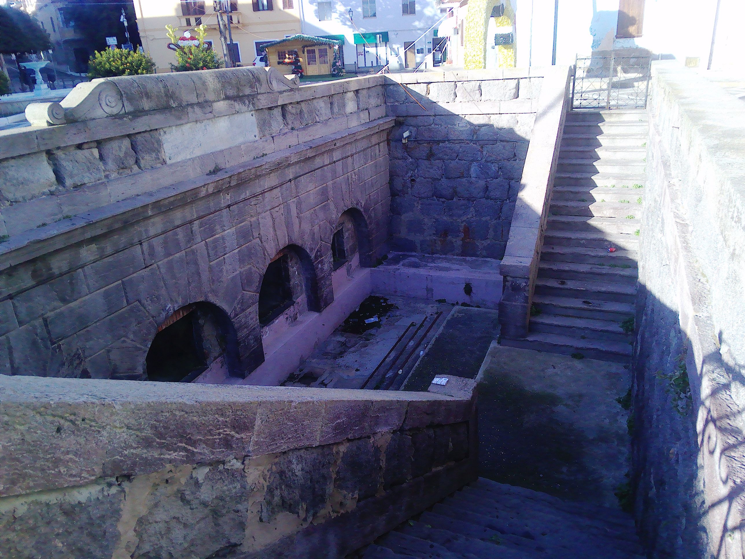 Ein paar Gassen unterhalb, in Richtung Südosten, am Ende einer mit uralten Ficus Benjamini-Bäumen bestandenen Straße, befindet sich die Piazza Italia. Hier steht ein römischer Brunnen. Ein großes, halbunterirdisches Bauwerk, in welches Stufen zu einem Becken hinunter führen. Bei der abendlichen Beleuchtung ist zu sehen, dass hinter den Nischen im unteren Teil der Anlage wohl eine Zisterne liegt.