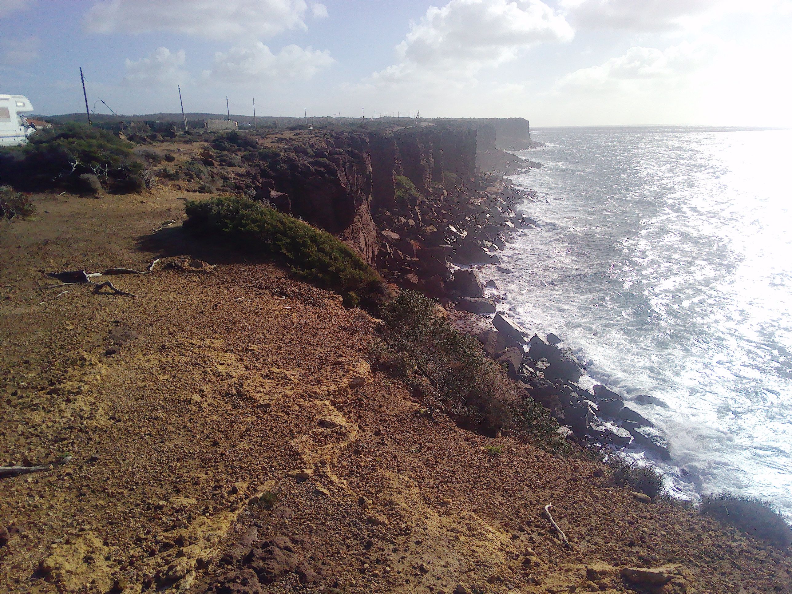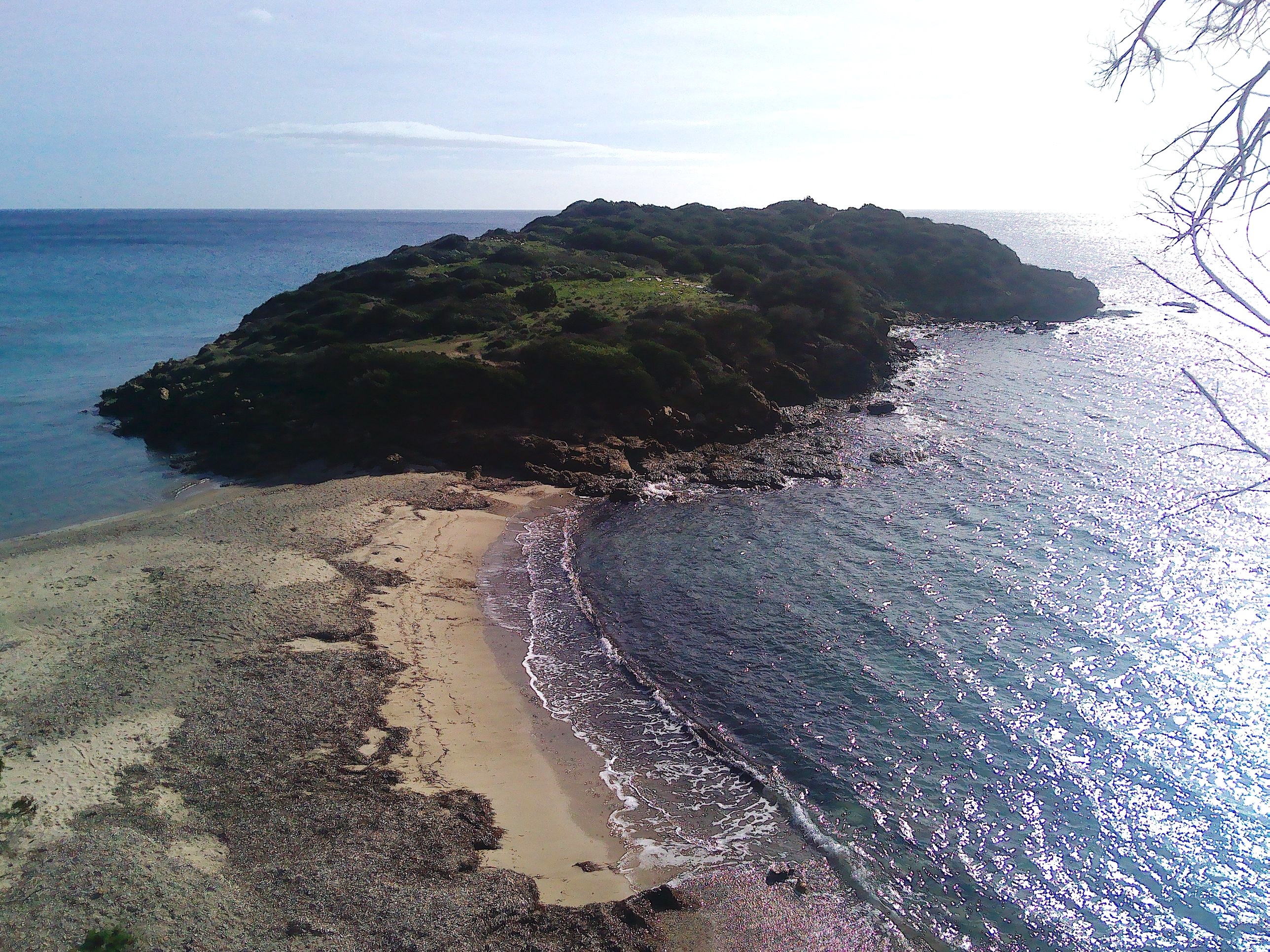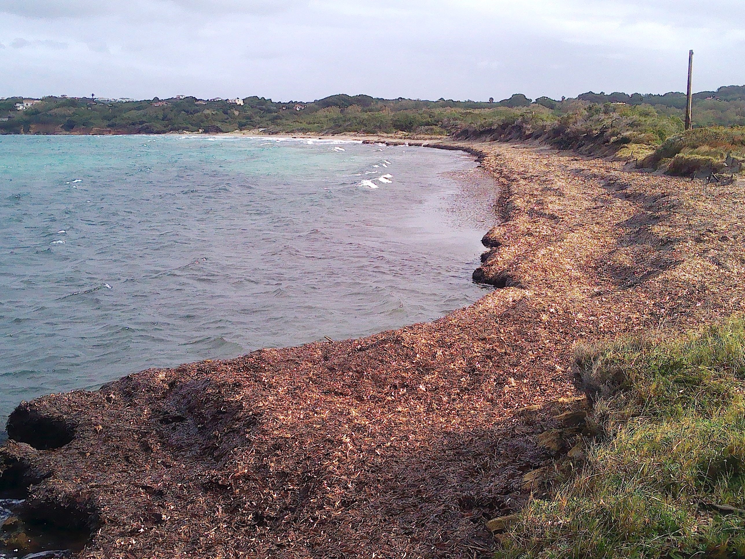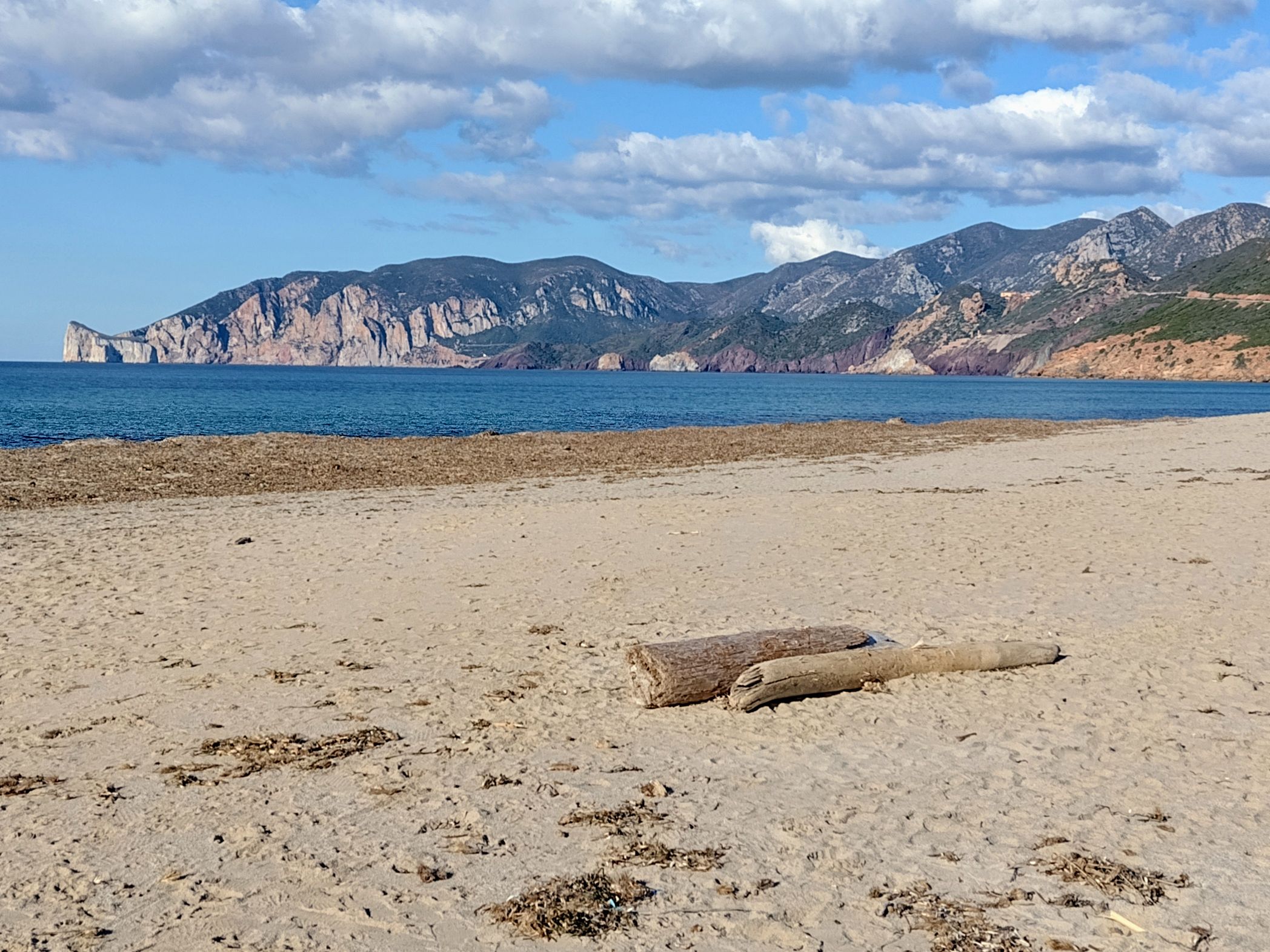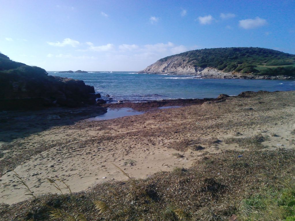 Beim Spiaggia Cala Lunga fällt die Straße steil ab, um auf der anderen Seite wieder ein Stück anzusteigen. Dort unten, eine Straßenbefestigung gibt es nicht, weil dieses Stück anscheinend oft überflutet ist, konnten wir einen Parkplatz finden. Mit einem kurzen Spaziergang gelangt man zu einem Strand, der am Ende einer langen Bucht liegt. Auf Werbetafeln findet man oft ein Bild dieses Strandes, im Sommer mit türkisblauem Wasser und goldenem Sand, eben ein Postkartenfoto. Im Winter bietet sich dagegen ein Bild der Zerstörung. Der Strand wie auch der große Parkplatz wurden von den Wellen zum Teil weggespült, alles ist von totem Seegras bedeckt. Links vom Strand führt ein kleiner Weg den Berg hinauf, von wo aus man sich das Ganze von einer erhöhten Position ansehen kann.