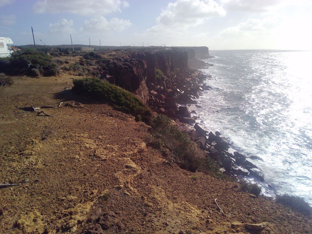 Am allerschönsten ist der Blick die Küste gen Norden entlang. Die Farbigkeit der Steilküste ist einzigartig. Weiß, hell- und dunkelrot wechseln sich stark abgegrenzt voneinander ab. Überall sieht man, dass in früheren Zeiten Mineralien abgebaut wurden. Die Berge sind an vielen Stellen angeknabbert, davor liegt der Abraum. In einen der Berge oberhalb Nebidas hat man sogar eine tiefe Narbe in den Abhang getrieben.