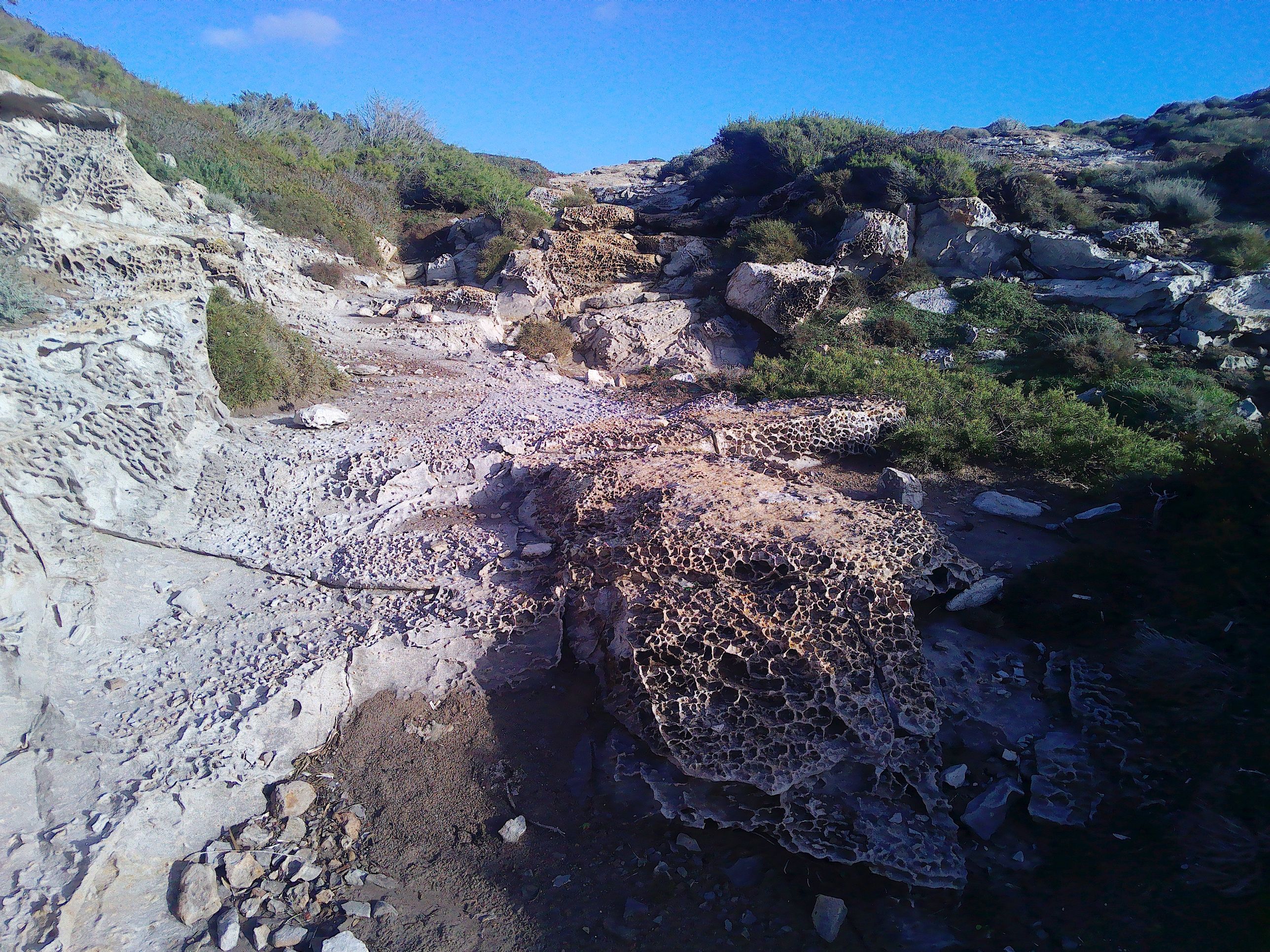 Von der anderen Seite des Hügels aus bietet sich ein wunderbarer Blick auf die spektakuläre Cala della Signora. Wenn man die Bucht vom Parkplatz aus erreicht, ist es nicht weniger spektakulär. Der Zugang sieht aus wie ein trockener Wasserfall, mit Zufluss und Abbruchkante. Tatsächlich scheint dort manchmal viel Wasser hinunter zu fließen. Interessante netzartige Auswaschungen sind dadurch in dem weißen Gestein entstanden.