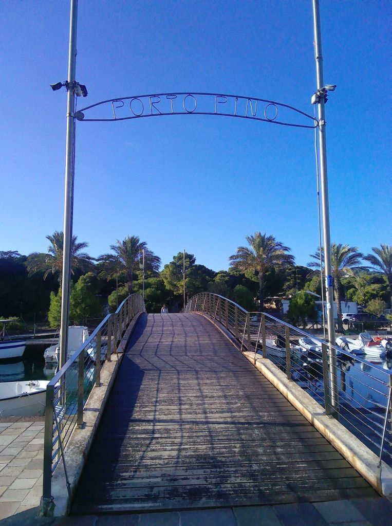 In Porto Pino läuft alles noch sehr gemächlich. Eigentlich ist es ein kleiner Fischerort, aber inzwischen siedelt sich auch hier ein wenig Tourismus an. Im Kanal zwischen den Salinen und dem Strand liegen die Fischerboote in langer Reihe. Zwei Brücken führen über den Kanal. So gelangt man von dem riesigen Parkplatz an den langen weißen Strand, der sich auf einer Nehrung entlang zieht.