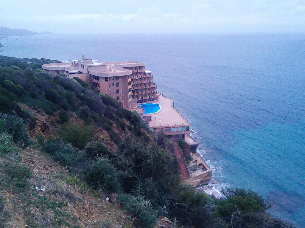 Gleich, wenn man das Wasser erreicht, blickt man auf die Marina di Teulada auf der anderen Seite der Bucht, mit der vorgelagerten Isola Rossa. Ein Stück die Küstenstraße weiter bietet der Aussichtspunkt einen weiteren tollen Blick entlang der Küste. Gleich unterhalb steht ein großes Hotel, welches sich an die Klippen klammert.
