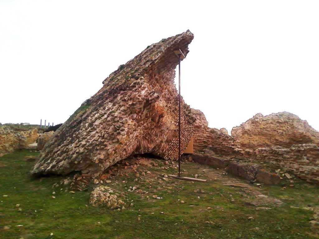 Gleich nebenan befand sich die große „Therme am Meer“. Anhand des erhaltenen Pfeilers, der eines der Gewölbe trug, wird einem die Größe der Anlage bewusst. Inzwischen hat sich das Meer einen Teil der Therme geholt, wie auch weitere Teile der Stadt, die direkt am Rande des Kaps lagen.