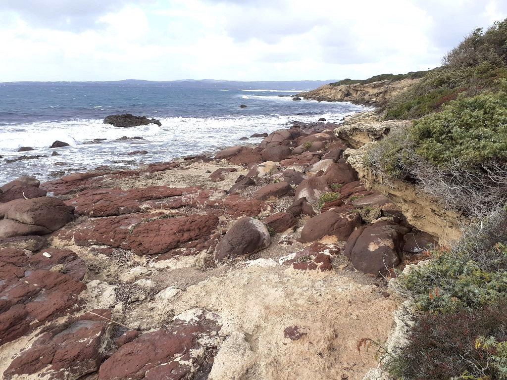 Links vom Strand fanden wir den gleichen interessanten Gesteinsaufbau wieder, den wir schon in Calasetta gefunden hatten, an dem Berg mit dem großen weißen Kreuz darauf. Das meiste ist Trachyt in verschiedenen Farben.