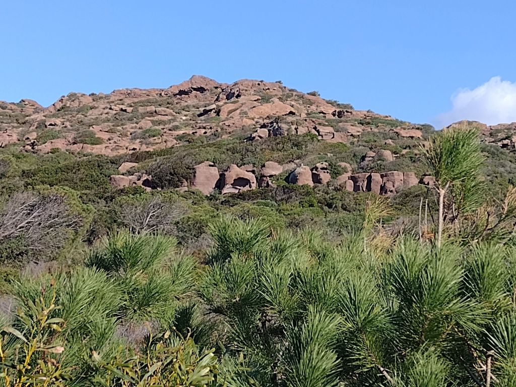 In den Felsformationen sind merkwürdig ausgehöhlte Felsbrocken zu sehen. Der eine sieht aus wie ein „Dickmann“. Dies zieht sich bis zum oberen Rand des Berges. Dort stand einmal die Nuraghe Baccu Ollastra.