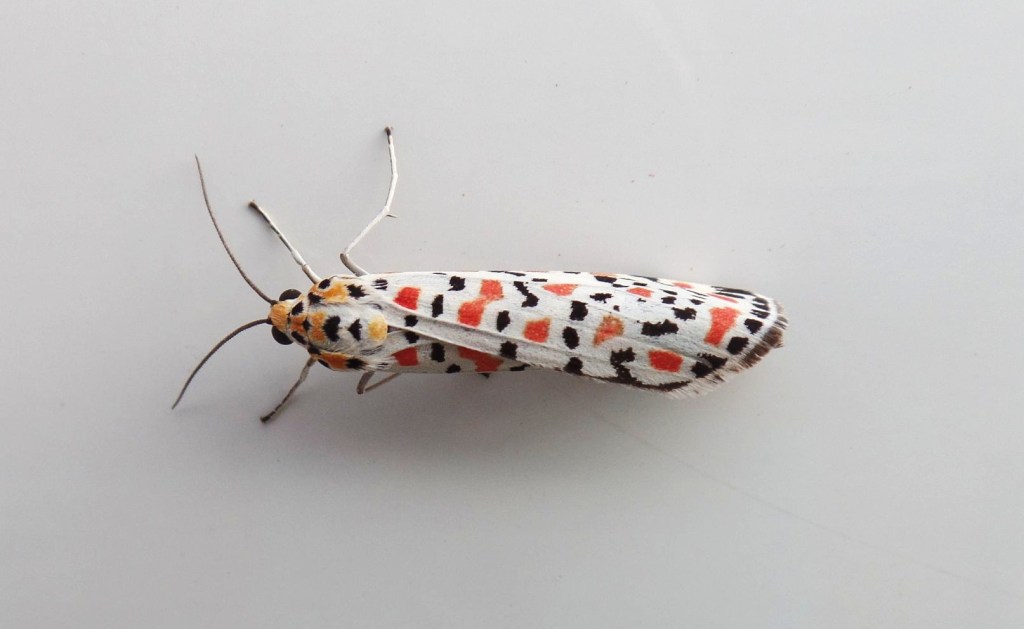 Und noch eine zweite Überraschung wartete auf uns: ein Harlekin-Bär, oder Punkt-Bär. Nein, es ist kein Bär, falsch vermutet. Es ist ein Falter. Solch einen außergewöhnlich gemusterten Falter haben wir noch nie gesehen. Er hatte seine Flügel ganz zusammengefaltet und saß auf der Seite unseres Wohnmobils. Heimisch ist er in Nordafrika, aber durch die Klimaerwärmung gelangt er immer weiter nach Norden. Einige soll es auch schon in Deutschland und sogar in England geben.