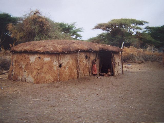 Das Dorf wird rundherum von trockenen Akazienzweigen vor wilden Tieren geschützt, dahinter stehen die Hütten der Menschen. An solch einer Hütte wird eine Woche lang gebaut und sie hält dann ungefähr sechs Jahre. Das Grundgerüst besteht aus Zweigen, die Zwischenräume werden mit einem Sand-Wasser-Gemisch ausgefüllt. Das Dach wird mit Leder ausgelegt und ebenfalls mit diesem Gemisch belegt. Ein paar wenige, winzige Öffnungen in der Wand sorgen nicht für genügend Licht in der Hütte. Eine Trennwand teilt den Innenraum in zwei Räume mit Liegestatt und Bank, der eine Raum hat einen „Schrank“, der andere einen Tisch. Die ganze Inneneinrichtung ist aus Holz oder Zweigen und Leder hergestellt.