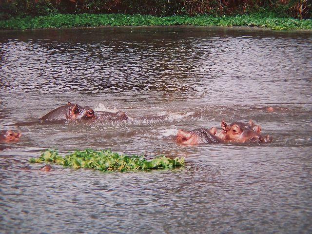 Toll, jetzt bekamen wir auch noch Hippos zu sehen, was will der Mensch mehr? Allerdings beschränkte sich das Sichtbare der Nilpferde zum größten Teil auf die Augen, Ohren und Nasenlöcher, alles andere war unter Wasser. Trotzdem war das beeindruckend. Am anderen Ufer lag ein Krokodil, das sich sonnte.