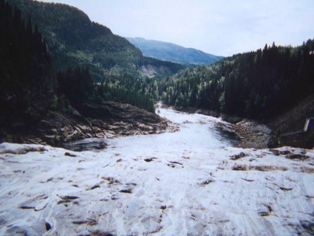 Wasserfall ist allerdings zu viel gesagt. Früher war das mal einer, heute steht hier ein Wasserkraftwerk und der Wasserfall ist nur noch selten in Betrieb. Nur ein kleines Rinnsal und eine Lachstreppe sorgen dafür, dass der Fluss noch fließen kann.