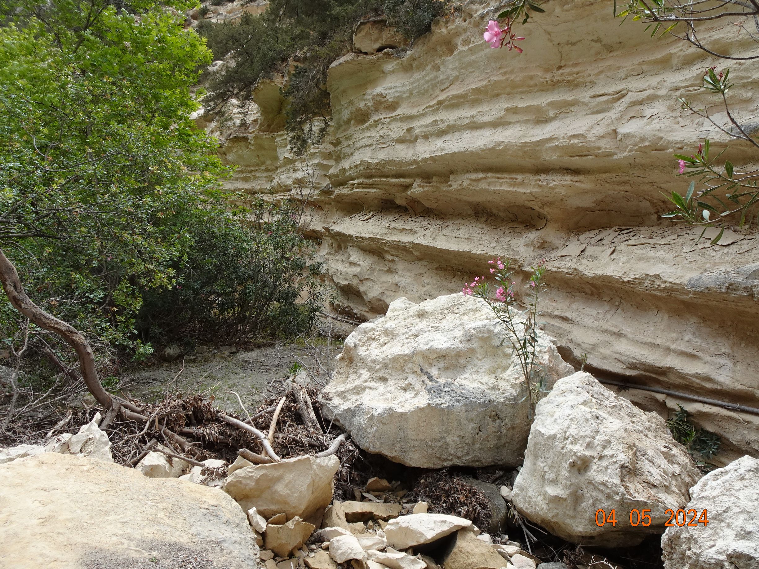 Da wir immer noch Zeit hatten, fuhren wir durch Avdimou, um uns den Prastio-Wasserfall anzusehen, den wir bei Google Maps entdeckt haben. Das ist nicht weit von Pissouri entfernt. Wir stellten das Auto ab und folgten dem Hinweisschild. Nur ein schmaler Pfad führt durch die trockene Landschaft, in der stachelige Büsche wachsen. Dann verteilen sich viele Pfade und wir standen etwas ratlos da. Unserem Instinkt folgend fanden wir einen Zugang zum Rand des Flusstales, das unter uns lag. Dort entdeckten wir eine helle Sandsteinplatte, halbrund geformt, unter der sich so ziemlich nichts befindet. Das soll der Wasserfall sein, wenn denn Wasser da wäre. Ein ganzes Stück weiter unten liegt das ziemlich ausgetrocknete Flussbett. Eigentlich hatte ich mir einen Wasserfall etwas anders vorgestellt.