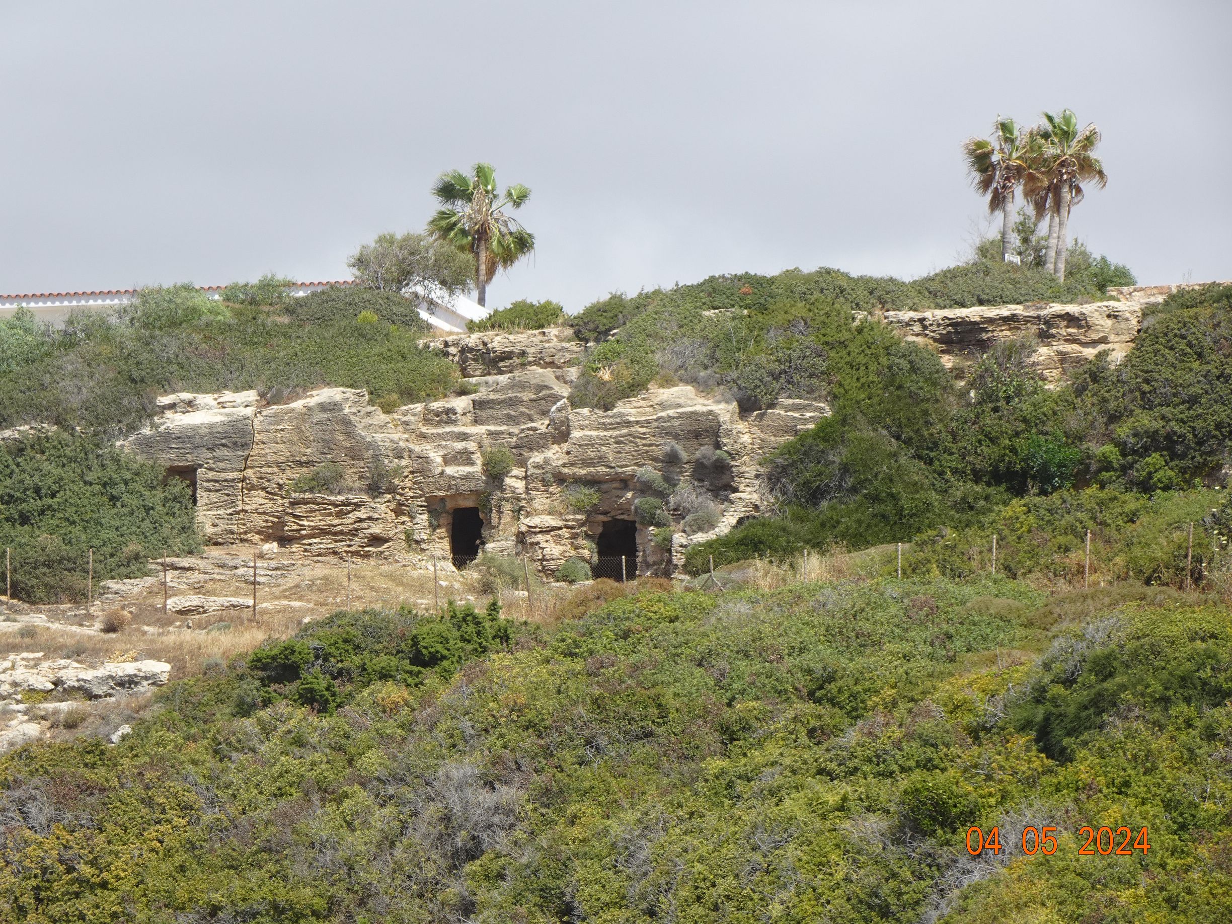 Oberhalb in den Felsen befindet sich eine antike Nekropole, die Peyia Gräber. Wir begnügten uns mit dem Bestaunen eines Teils der in die Felsen gehauenen Gräber von unten her.