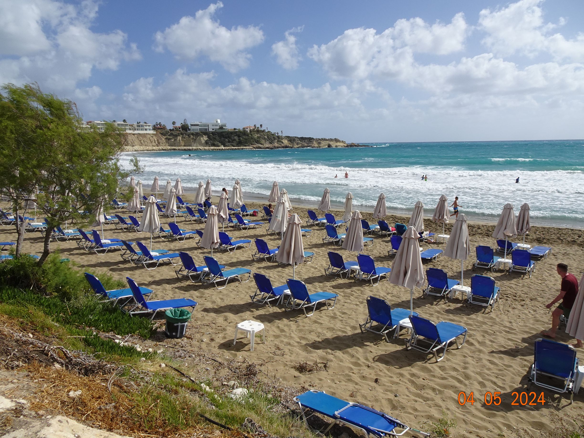 So erreichten wir sicher den langen Sandstrand, den schönsten, den wir bisher auf Zypern gesehen haben. Die Sonne strahlte wieder und das Wasser schimmerte herrlich türkis und lockte Klaus zum Baden. Zuvor wollten wir noch einen Eiskaffee auf der einladenden Terrasse des Restaurants „Columbia Sun“ genießen. Zuerst mussten wir der Bedienung erklären, was wir wollten, denn von einem Eiskaffee mit Eis hatte die wohl noch nie etwas gehört. Als wir bezahlen wollten, legte sie uns eine Rechnung hin, die sich gewaschen hatte. 10,-€ zahlten wir für einen Eiskaffee! Eigentlich wollten wir es uns auf einer der Liegen, die vor der Terrasse stehen, gemütlich machen, aber da meinte der Kellner, dass dies Aufschlag kosten würde. Ganz schön unverschämt.
