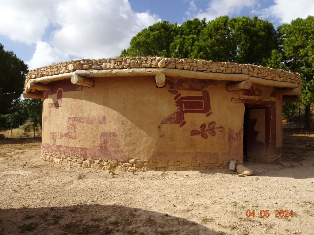 Von hier aus fuhren wir etwas in Landesinnere, nach Lemba. Dort fand man bei Ausgrabungen eine Rundhüttensiedlung, die aus der Zeit 3500 bis 2400 v.Chr. stammt. In der Anlage mit sieben Rundhütten sind auch einige schlichte Gräber integriert. Einen Teil der Grundmauern hat man belassen, wie man sie ausgegraben hat. Einen anderen Teil hat man rekonstruiert, aus Holz und Lehm. Sogar Malereien brachte man an den Außenwänden an. Ein Teil der Hütten waren Wohnhütten, andere wohl Lagerhütten, denn diese sind kleiner. Jedenfalls ist es sehr interessant, auch einmal so etwas zu sehen. Der Besuch ist kostenlos. Es gibt eine Infobroschüre über diese Ausgrabungsstätte, die man jedoch nur bei der entsprechenden Stelle kaufen kann. Darüber informiert ein Aushang in der großen Wohnhütte.