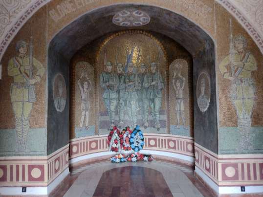 Es gibt zwei Etagen in dem Bau. Im unteren Bereich sind die Soldaten alle namentlich aufgeführt. Beide Räume sind über und über mit Mosaiken, gestaltet. Das Glas der Mosaiksteine stammt aus Murano, erzählte uns der Mann am Einlass, also sehr teuer.Von der Plattform vor dem Mausoleum aus schweift der Blick weit hinaus in die Hügellandschaft. Leider zerstört eine Zementfabrik den Zauber.