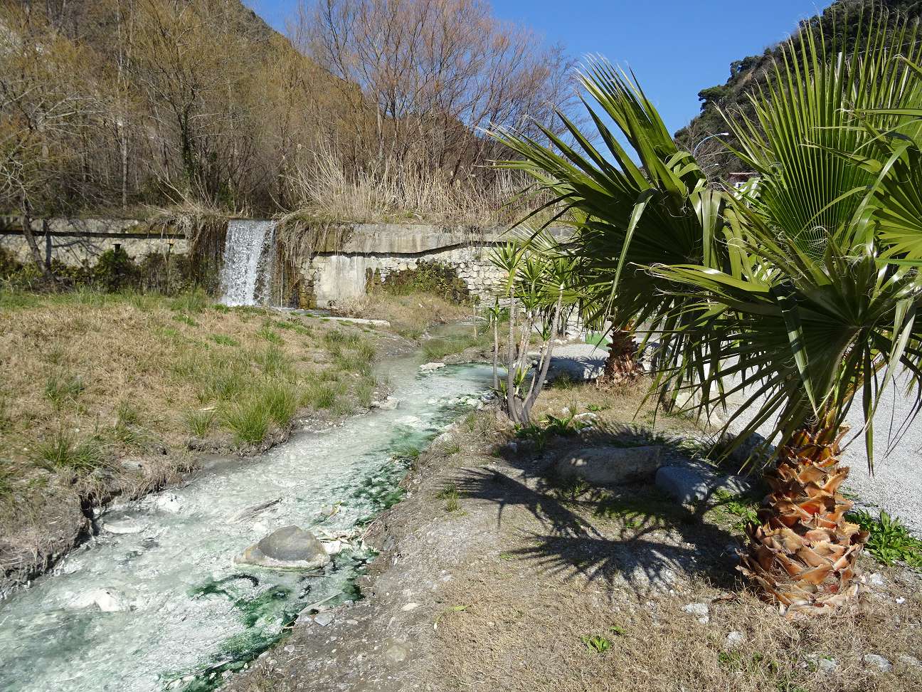 Da ich ungern den gleichen Weg wieder zurück gehe, nahm ich den direkten Weg Richtung Süden nach unten. Da hatte ich mich auf etwas eingelassen. Der Weg ist 1,1km lang und kommt an der Ausfallstraße nach Mondello heraus. Was ich nicht wusste und erst merkte, als es zu spät war, war, dass der horizontale Weg auf die 1,1km keine 100m beträgt. Das heißt, der Weg ist ein fast senkrechter Klettersteig zwischen zwei Steilwänden, über den eigentlich ein Bach nach unten stürzt. Über eine Stunde kostete mich die „Abkürzung“, die mir so ziemlich alles abverlangte.