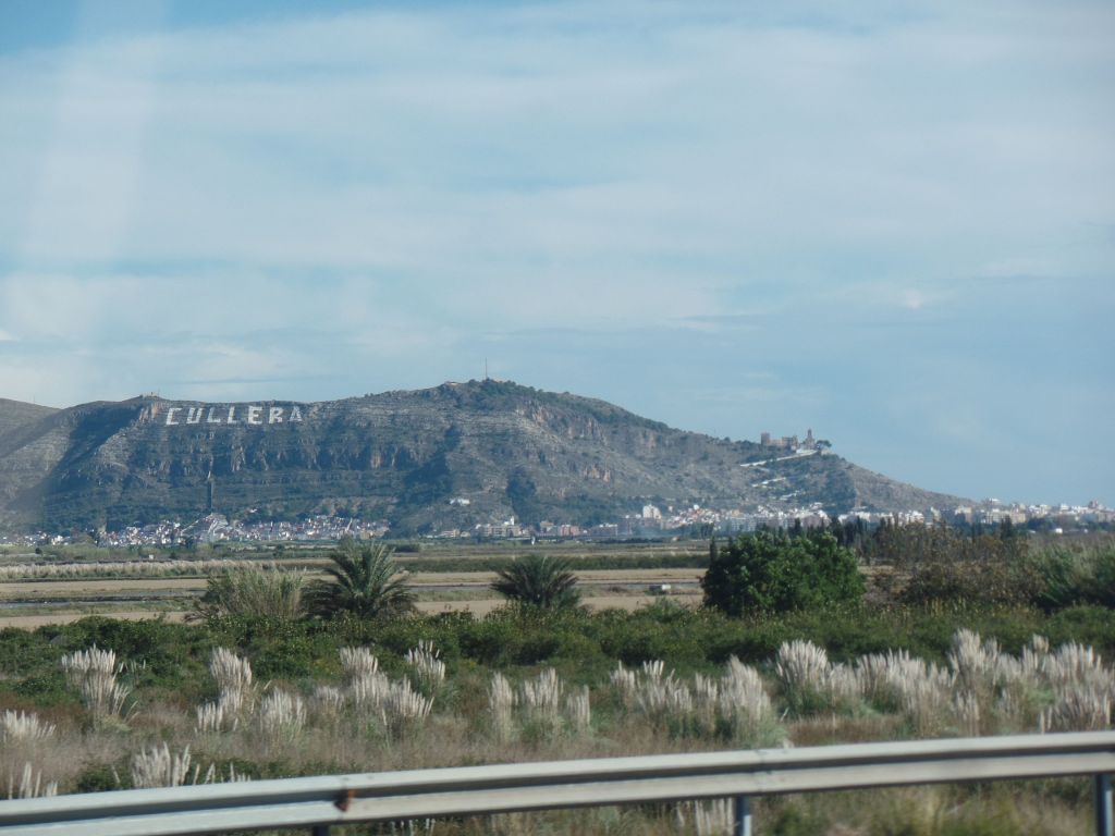 Man fährt durch eine herrliche Hügellandschaft. Bei Cullera erhebt sich ein Berg, an dessen Flanke der Schriftzug der Stadt zu lesen ist.