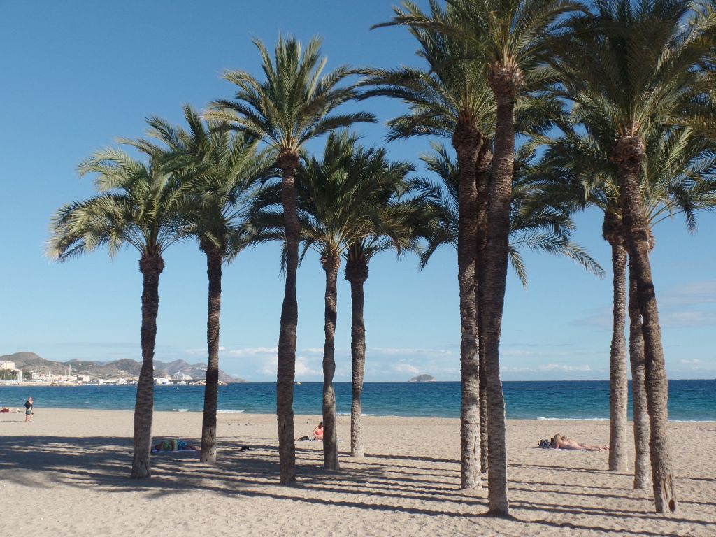 Nach diesem Besuch spazierten wir zum langen Sandstrand von Villajoyosa, an dem hier und da Palmen stehen. Auch entlang der Promenade stehen Palmen.