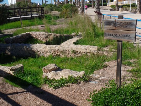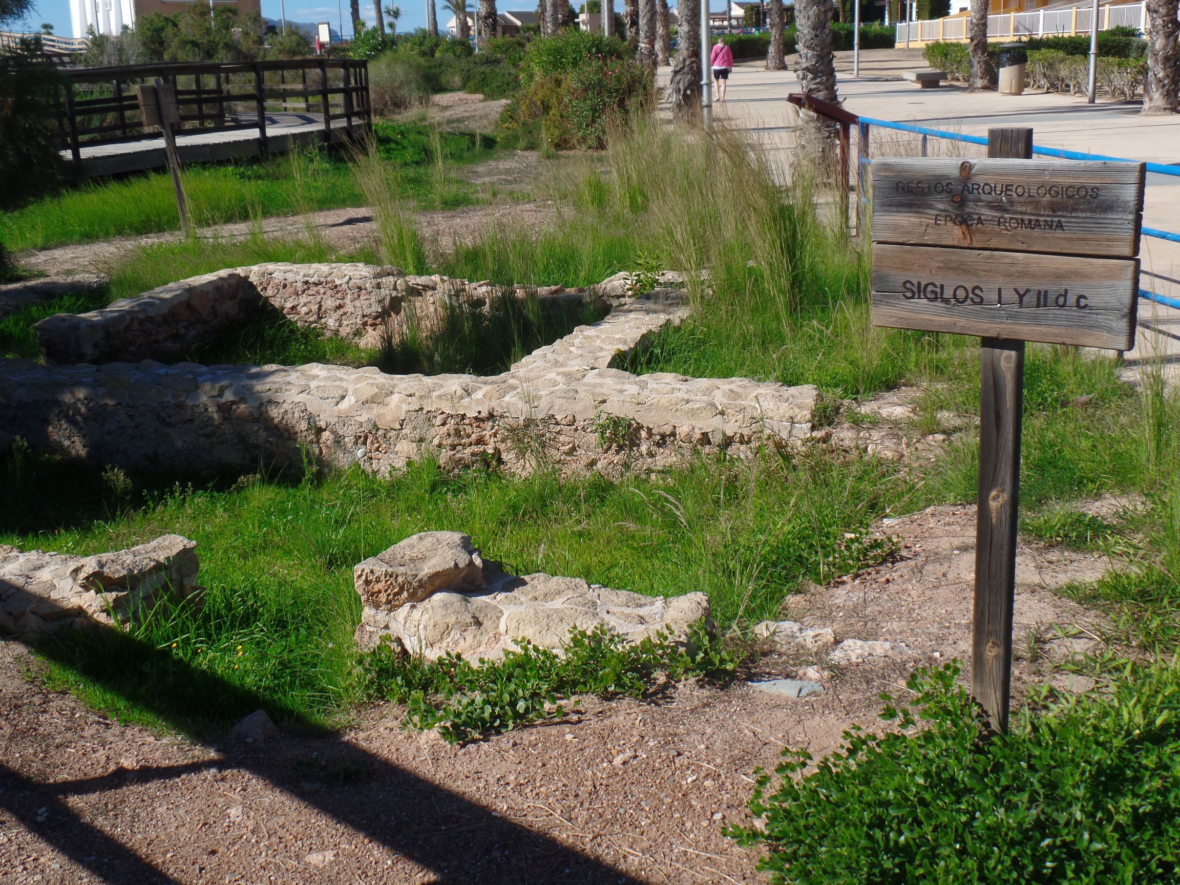 Gleich dahinter hat man 2003 bis 2006 Grundmauern einer römischen Siedlung ausgegraben. Der Ort heißt Los Tintoros, weil es dort einige Lagerhäuser gab und Fischer der Gegend ihre Netze pflegten und aufbewahrten, sowie ihre Flöße färbten, so heißt es in der Erläuterung. Vielleicht heißt es auch: ihre Boote bemalten. Dazu gab es eine Töpferei mit mehreren Räumen und sieben Brennöfen, um Keramiken herzustellen. Es wurden Töpfe, Schüsseln, aber auch Fliesen und Ziegel gefertigt. Die Brennöfen waren nicht alle gleichzeitig in Betrieb, sondern wurden nach und nach aufgebaut, wenn die alten Öfen nicht mehr brauchbar waren.