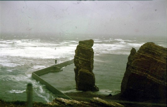Der Besuch Helgolands vor 27 Jahren war eher eine Herausforderung als ein Erlebnis. Als wir in Bremerhaven auf das Schiff stiegen wehte schon eine steife Brise. Diese steigerte sich während der Überfahrt auf Windstärke 12. Eigentlich hätte das Schiff nicht mehr hinausfahren dürfen, aber keiner hatte damit gerechnet, dass der Sturm so schnell vorwärts kam. So erwischte er uns mit voller Wucht. Dazu peitschte der Regen fast waagerecht. Auf der Reede vor Helgoland angekommen, mussten wir trotz der Wellen, die halb so hoch wie das Schiff waren, ausgebootet werden, vom Baby bis zum Gebrechlichen. Die Einrichtung des Schiffes war schon durchgewürfelt worden, die Kombüse gab es praktisch nicht mehr.