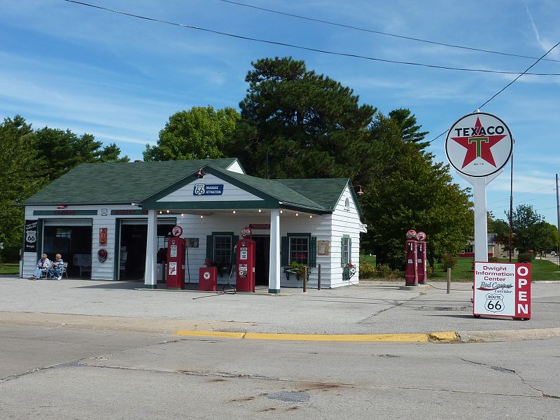 In Dwight besuchten wir die „Amber-Becker Texaco Gas Station“, im Jahre 1932 gebaut. Diese Tankstelle gilt als die am längsten operierende Tankstelle entlang der Route 66. 66 Jahre, von 1933 – 1999. Nach allgemeinen Restaurationsarbeiten wurde sie 2007 als Besucherzentrum wiedereröffnet.
