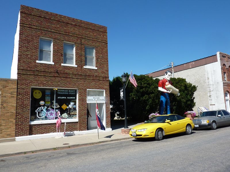 Atlanta ist ein kleiner Ort mit vielen Sehenswürdigkeiten, wie den Atlanta´s Bunyon Giant, den J.H. Howes Grain Elevator (Getreidespeicher mit Aufzug) & Museum und wieder historische Bauten wie den Glockenturm und die Bücherei von 1908. In der Gunnar Mast Trading Post, einem kleinen Laden mit sehr interessanten alten Dingen zur Route 66, trafen wir Gene Martin, einen absoluten Liebhaber von Marianne Rosenberg. Er gab uns eine Ansichtskarte mit einer Botschaft für Marianne mit, die wir ihr übergeben sollten. Seine Vorfahren waren vor langer Zeit aus Deutschland über die Schweiz in die USA ausgewandert.