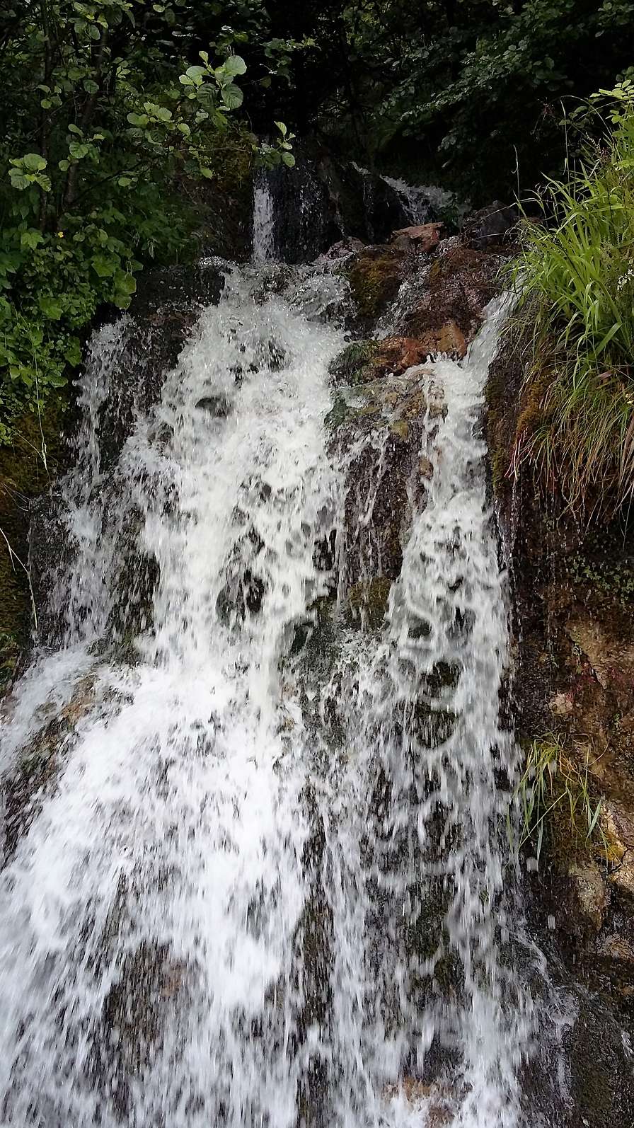 Am Ufer entlang stürzen sich heute, nach dem großen Regen, überall Wasserfälle über die steilen Uferhänge in die Tiefe, die gestern noch nicht da waren. Die Wasserfälle, die wir gestern sahen, führen heute 4-5mal soviel Wasser. Da kommen ganz schöne Wassermassen aus den Bergen herunter.