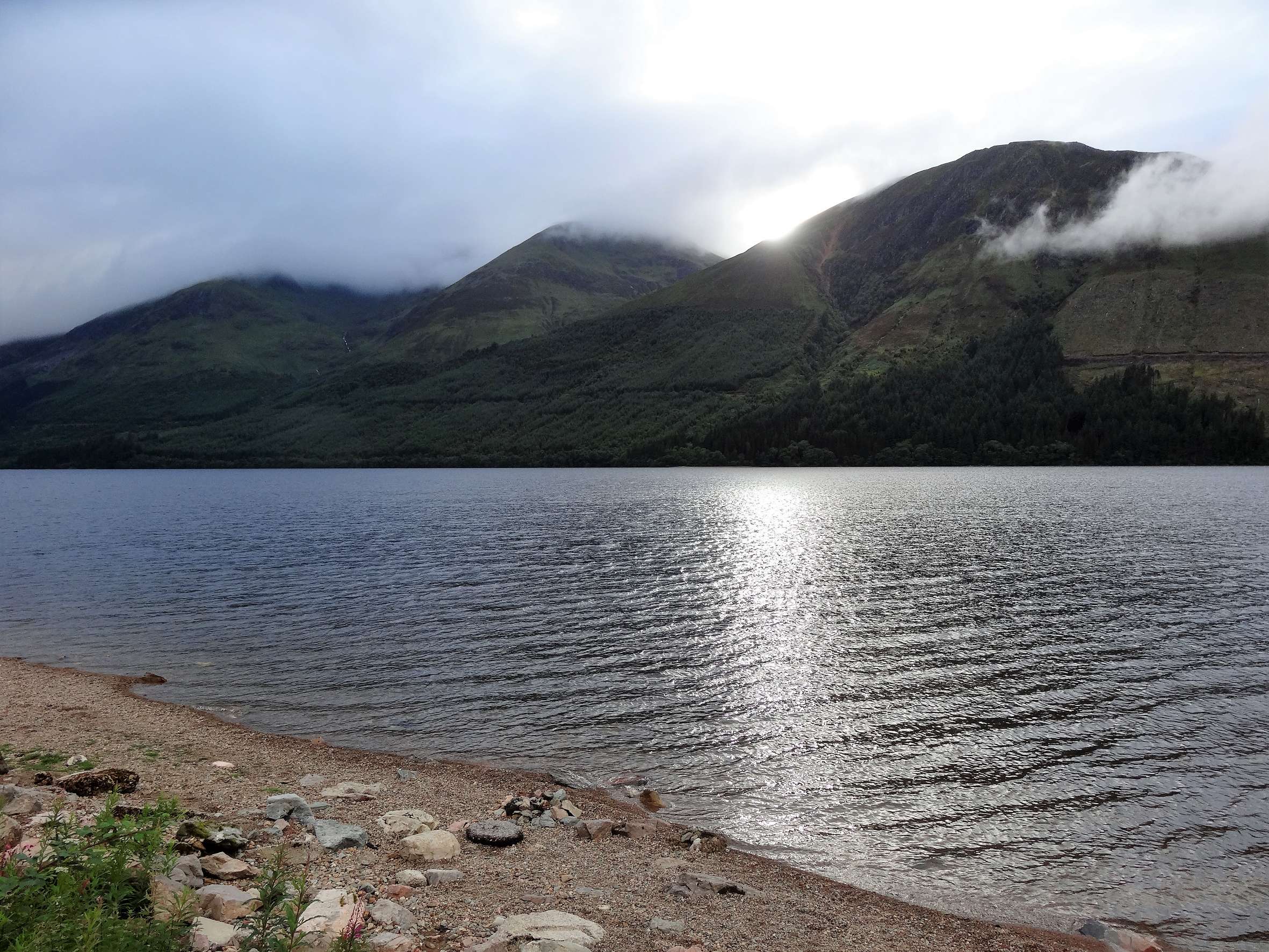 Durch eine wildromantische Tallandschaft führt die A82 am Loch Oich und am Loch Lochy vorbei, mal links vom See, mal rechts. Am Loch Lochy fanden wir einen wunderschön gelegenen Parkplatz direkt am Seeufer, der sogar eine Art Wohnmobilstellplatz hat. Wir konnten nicht anders, als dort zu übernachten. Die Wolken hingen immer noch tief, aber zwischendurch ließ sich auch kurz die Sonne sehen. Das zauberte eine ganz besondere Abendstimmung in die Berge und über den See. Ein kleines Lagerfeuer vollendete den schönen Abend. Die Abende sind auf diesem Breitengrad sehr lang. Bei schönem Wetter ist es noch um 23.15 Uhr nicht richtig dunkel.