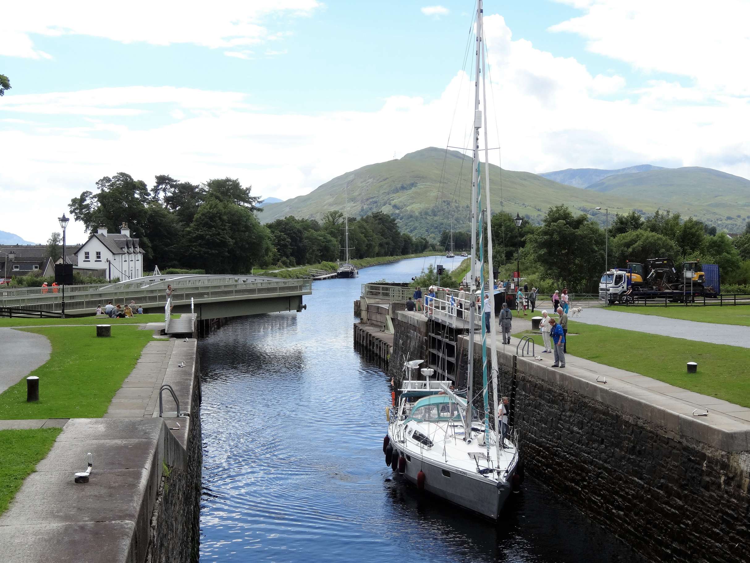Der Caledonian Kanal, der die Lochs in dieser geografischen Linie verbindet, muss vor den Schleusen in Fort Augustus zuerst das hiesige Schleusensystem passieren. Diesmal kamen wir zurecht, um Schleusungen zu beobachten. Motor- und Segelboote müssen neun Kammern überwinden. In Richtung Westen befinden sich direkt hinter dem letzten Schleusentor zwei Drehbrücken. Beide Brücken, eine für den Straßenverkehr, eine für die Eisenbahn, werden kurzfristig geöffnet, um die Boote durchfahren zu lassen. Solch eine Kombination ist wohl einmalig.