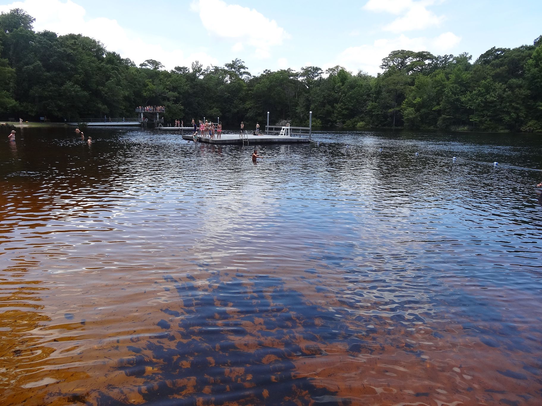 Die Blue Spring speist den St. Johns River. Die Quelle selbst hat bis kurz hinter die Badestelle, die ein Stück weiter unten liegt, glasklares Wasser, wenn nicht die vielen Badenden alles aufgewühlt haben. An einer Stelle wird das Wasser plötzlich braun, wie der Rest des Flusses. Ab dort tummeln sich die Alligatoren. Zwei Tage hielten wir uns im Blue Spring State Park auf und an beiden Tagen beobachteten wir Manatees, die sogar manchmal trotz des Betriebes dort bis in den Badebereich kommen. Am ersten Tag schnorchelten wir von der Badestelle bis zur Hauptquelle, was auf Grund der Strömung nicht ganz ohne ist. Große Langnasenhechte halten sich in Scharen in dem Flussarm auf. Dazu findet man Forellen, Welse, Barsche und andere Fischarten.