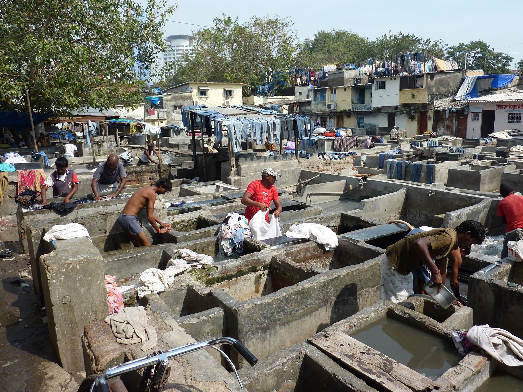 Den Anfang machte die große Wäscherei Dhobi Ghat fast ganz im Süden der Stadtteils Colaba. Der Taxifahrer hielt vor einem Viertel, in dem auf den Dächern Wäsche getrocknet wird. Unten sind lauter kleine Shops untergebracht, und darüber Behausungen, anders kann man dazu kaum sagen, zu denen meistens Hühnerstiegen führen. Ein Eingang in das Viertel war nicht zu sehen, aber unser Taxifahrer führte uns durch irgendein Schlupfloch in eine andere Welt. Durch eine Reihe kleiner, offener Räume führte er uns ins Herz der Wäscherei, die an die uralte Färberei im marokkanischen Fez erinnert. Jede Menge kleiner Wasserbassins mit Seifenlauge bilden den Mittelpunkt der Wäschersiedlung, in der auf kleinstem Raum gelebt und gearbeitet wird. Wenn die Wäsche hier ankommt, wird sie zuerst gekennzeichnet. Dann wird sie verteilt, gewaschen, gespült, getrocknet und gebügelt. Vom Bringen der Wäsche bis zur Auslieferung vergeht ein Tag. In der vier Monate langen Monsunzeit dauert der Prozess zwei Tage, da das Trocknen der Wäsche durch Maschinen erfolgen muss, die nicht in ausreichender Menge vorhanden sind. Restaurants, Hotels, das Militär, alle lassen hier ihre Bettwäsche, Handtücher oder Uniformen bis hin zu Teppichen waschen. Wie die Leute bei dem Durcheinander noch wissen, was wo ist, ist uns ein Rätsel. Es gibt sogar ein paar wenige Privilegierte, die eigene Maschinen und ihr eigenes Reich haben. Sogar zwei Schulen sind in diesem Viertel untergebracht, eine die ersten drei Klassen und eine die nächsten drei Klassen umfassende Schule. Das muss man einfach gesehen haben.