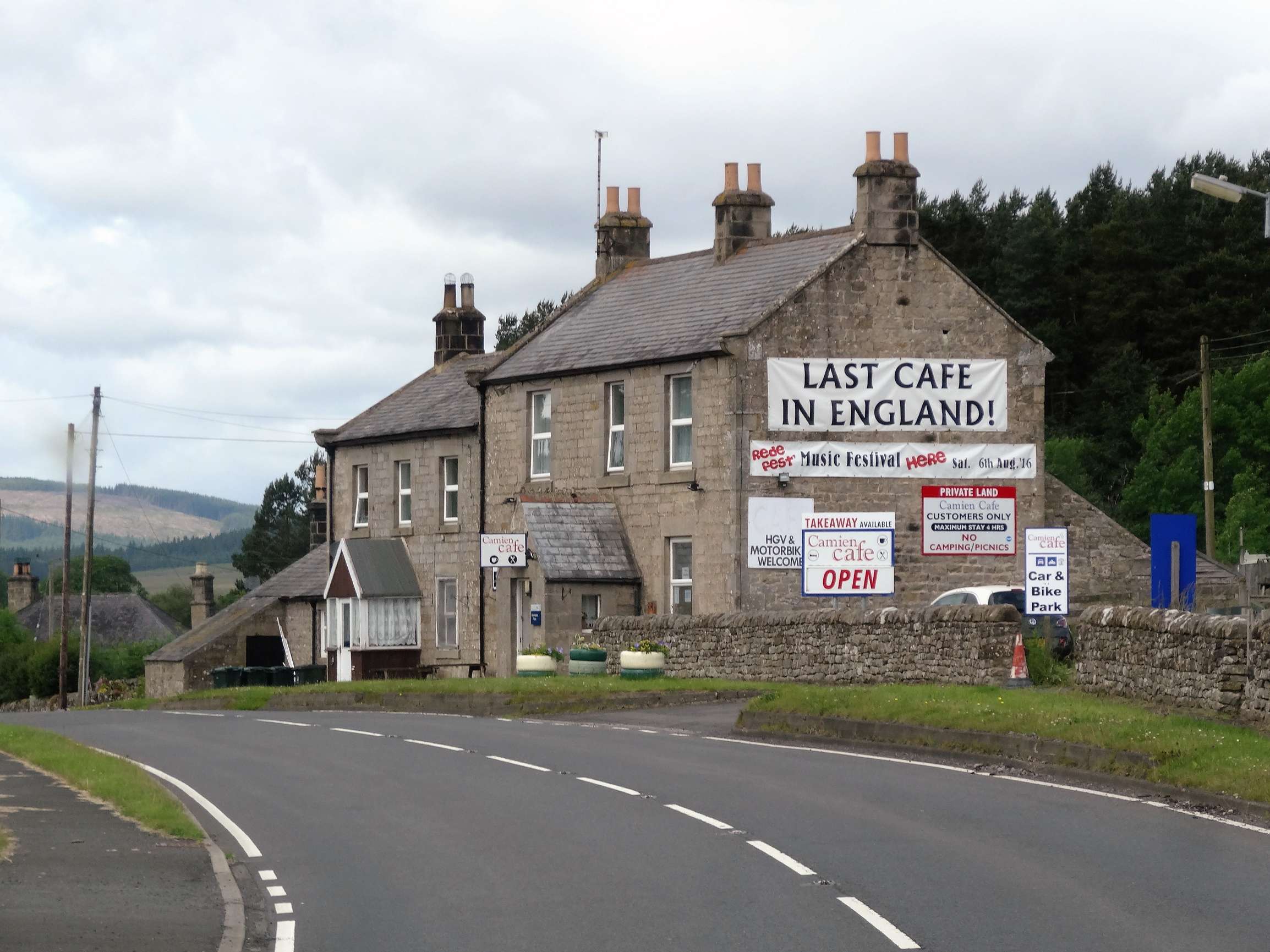 Inzwischen hat sich die Landschaft ein weiteres Mal geändert. Jetzt herrschen Grasland, noch mehr Schafe, Mäuerchen und kleine Waldstücke vor. Apropos Mäuerchen: viele dieser Steinmauern, die als Weide- und Grundstückbegrenzungen dienen und allerorten zu finden sind, stammen wohl von den römischen Forts und dem Hadrianswall, wie wahrscheinlich viele Wohnhäuser. Die Steine waren leicht zu beschaffen und ein idealer Baustoff für dieses nasse Wetter.