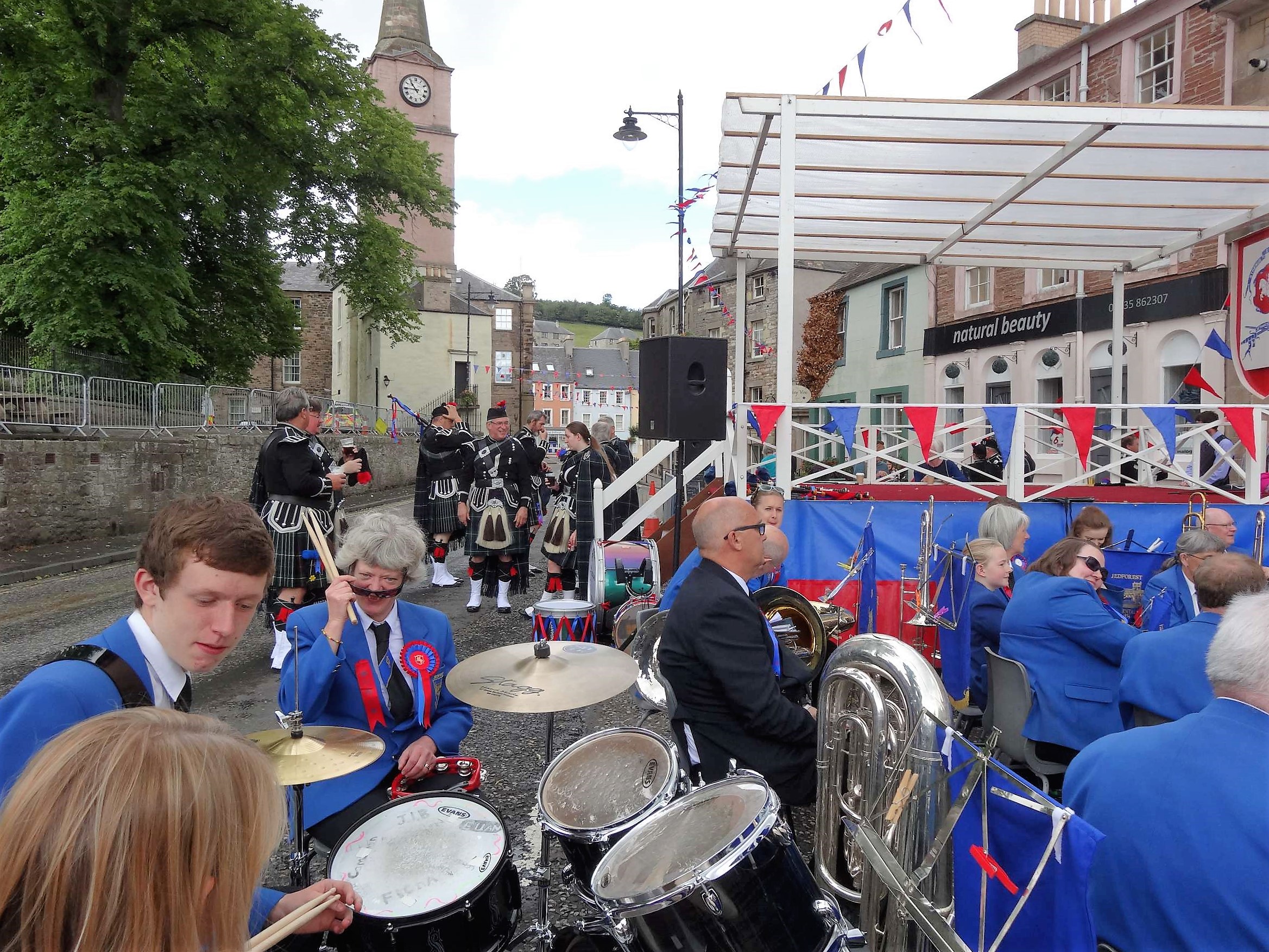 Bei unserem Besuch von Jedburgh trafen wir am Ortseingang auf eine Sperrung der Straße durch das Ordnungsamt. Wir durften passieren und suchten uns einen Parkplatz. Der zentrale Parkplatz, wie auch die Parkplätze bis dahin, waren alle mit Pferdeanhängern blockiert. Was geht hier bloß ab, fragten wir uns. Nachdem wir mit dem kleinen Smart doch noch ein Plätzchen ergattert hatten, spazierten wir auf die Abbey zu und hörten schon Musik. Vor der Abbey spielte ein Orchester, Musiker in Schottentracht standen bereit.