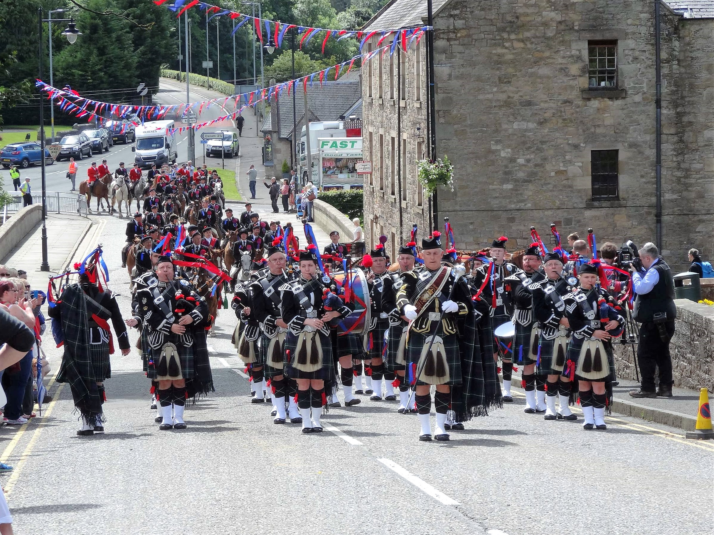 Inzwischen war ein Umzug in Jedburgh voll im Gange. Die Musikgruppe in den schottischen Kleidern führte den Zug an, dann folgten jede Menge Reiter. Vor der Abbey nahmen etwas später ein paar vornehm gekleidete Leute Aufstellung, an denen der Zug später vorbeimarschierte. Die Straßen waren von Menschenmassen gesäumt, es war ein wirklich großes Ereignis. In der Touristinfo erfuhren wir, dass es sich um das Jedburgh Callants Festival handelt, welches jedes Jahr um diese Zeit stattfindet. Es erinnert an die Zeiten des 13. und 14. Jahrhunderts, als die Schotten ihre Grenze gegen die Engländer verteidigten. Um sich vor Übergriffen zu schützen, patroullierten die verschiedenen Familien an der Grenze entlang.