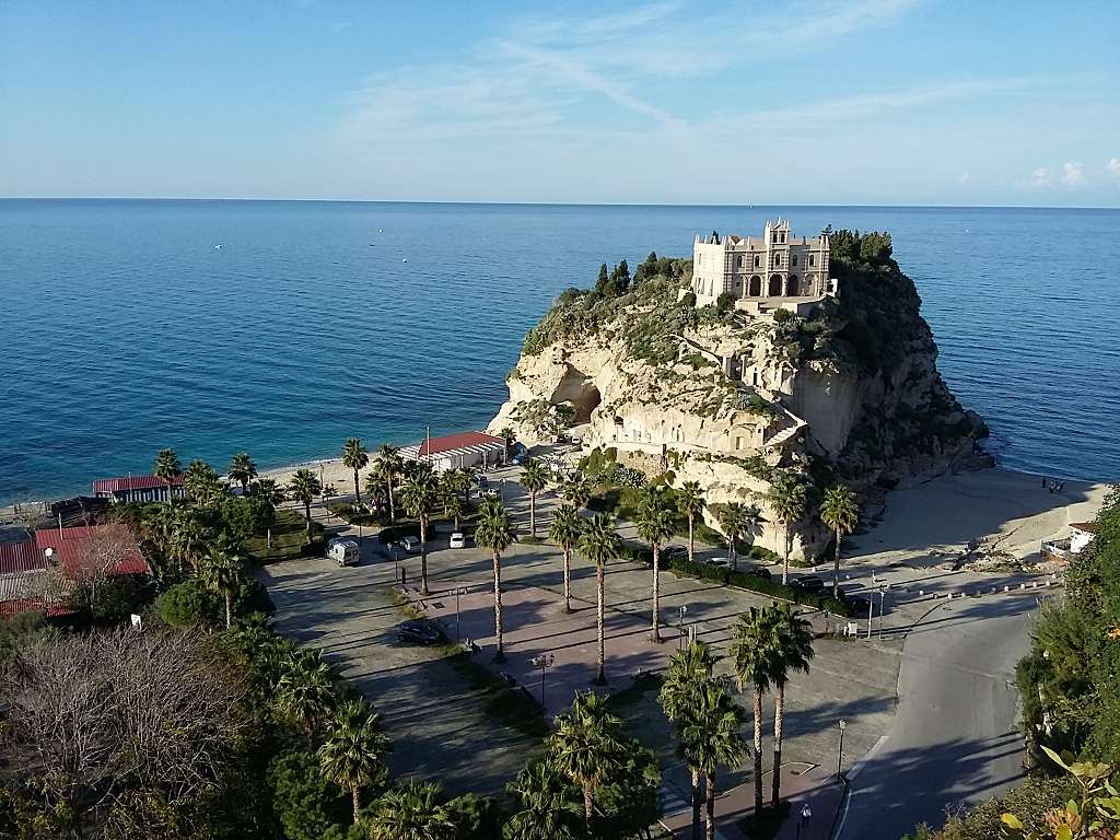 Über eine Treppe in der Nähe des westlichen Strandes erreicht man die Altstadt von Tropea. Von einem großen „Balkon“ sieht man nun auf den einzelnen Felsen mit der Kirche obendrauf. Eine zweite Treppe auf den Berg existiert an der gegenüberliegenden Seite.
