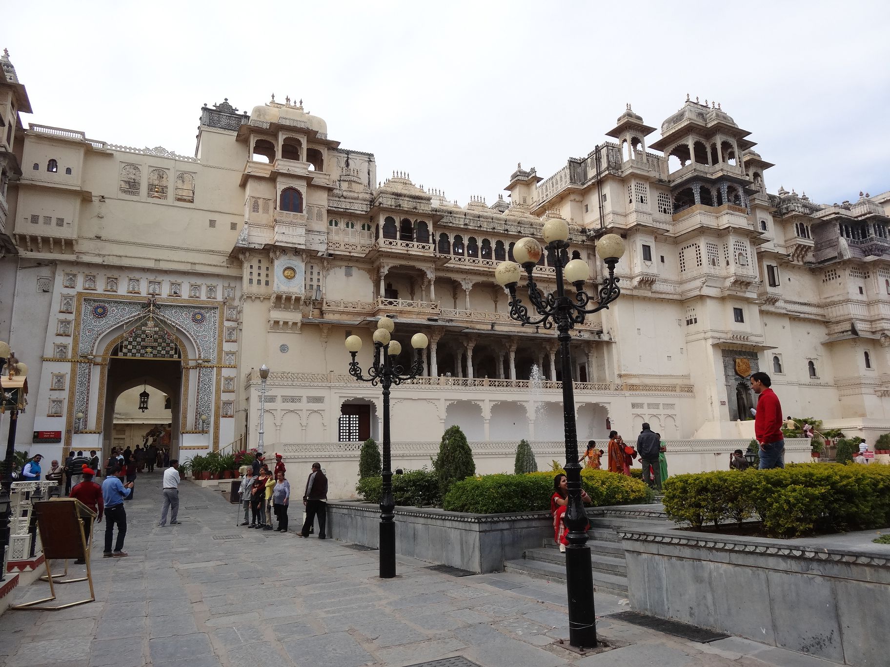 Im Anschluss an die Bootsfahrt besichtigten wir den Stadtpalast, also den Winterpalast des Maharana. Er ist im Aussehen einfach gehalten. Die unteren Etagen haben nur wenige Fenster und zeigen gar keinen Schmuck. Das hat mit den Angreifern zu tun, die das Schloss manchmal heimsuchten. Aus Gründen der Verteidigung sind die Türen im Inneren der Anlage alle sehr klein gehalten. So mussten sich die Angreifer beim Durchgehen bücken. Neben den Türen haben dann die Verteidiger mit Schwertern gestanden und konnten so leicht die Köpfe der Angreifer abschlagen. So erzählte es uns unser neuer Guide Wino. Im oberen Teil, der Anlage findet man dann wieder kleine Erker mit vielen Fenstern.