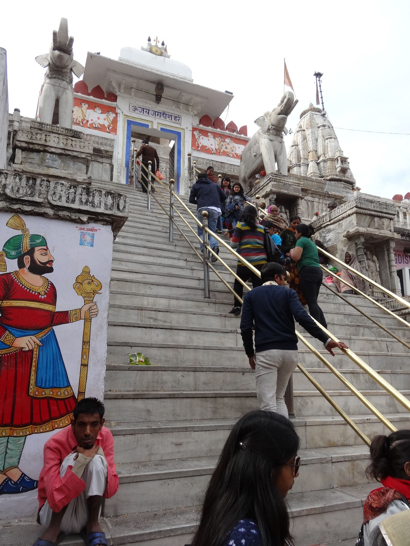 Nach der Besichtigung des Stadtpalastes nahmen wir eine kleine Stärkung in einem kleinen Restaurant vor den Toren des Palastes zu uns, bevor wir uns noch den Jagdish-Tempel ansahen. Darin fand gerade eine Betstunde statt, bei der fast nur Frauen zugegen waren. Sie saßen eng beisammen und sangen wahrscheinlich Gebete, von Musik und dem Duft der Räucherstäbchen begleitet. Überall lagen Maiskörner auf dem Boden, offensichtlich Opfergaben. Außerhalb des Tempels stehen kleine Schreine auf dem Gelände.