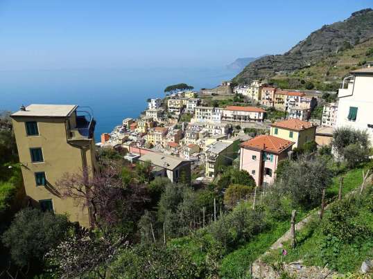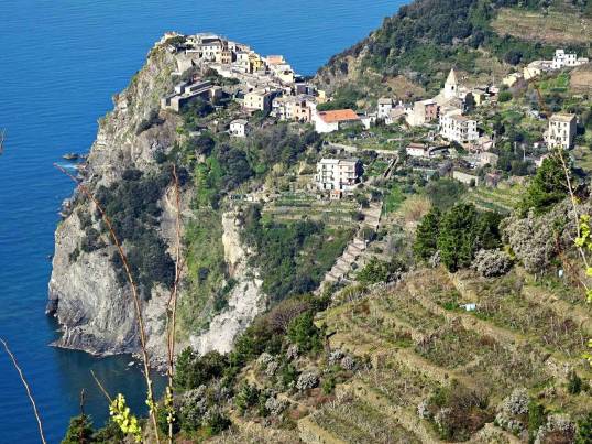 Einen zweiten Ausflug nach Cinque Terre unternahmen wir mit dem Auto. Wir starteten frühzeitig. Die Straße ist gut befahrbar, klettert kurz vor Corniglia aber wieder auf viele hundert Meter. An fast der höchsten Stelle ist eine Parknische. Von dort aus sahen wir uns das kleine Dorf, auf einer Klippe thronend, an.