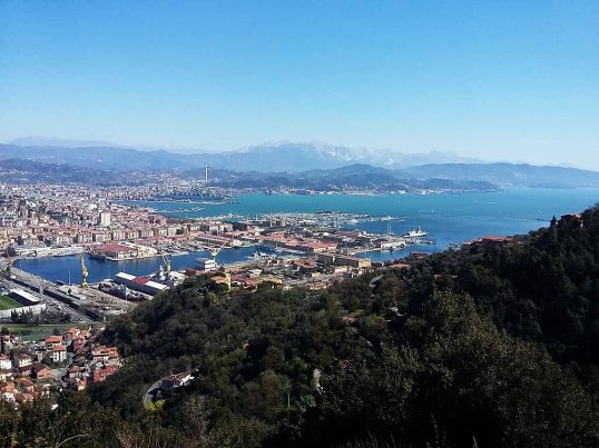 Dabei bietet sich ebenfalls ein schöner Panoramablick über die gesamte Bucht von La Spezia. Es ist einfach eine wunderschöne Ecke. In einiger Entfernung sieht man die Grube Fantiscritti von Carrara.