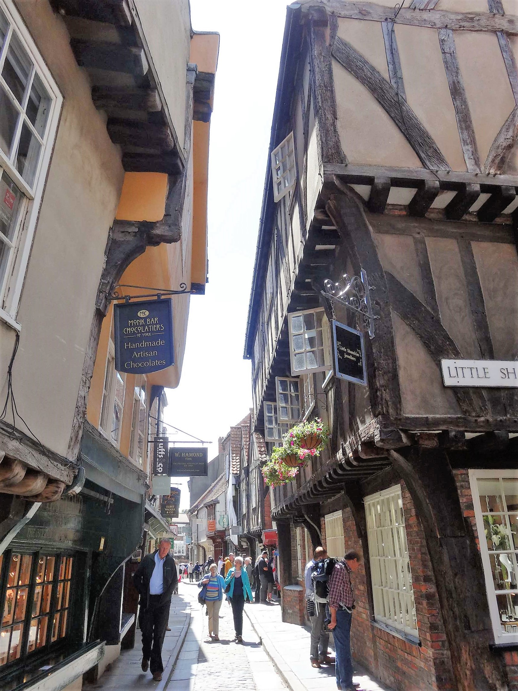 Die Shambles, fünfhundert Jahre alt, ist die engste Gasse Yorks. Früher war sie die Heimat der Schlachter und Fleischer. Heute sind, wie in fast allen Fachwerkhäusern sonst, Kneipen, Teestuben und kleine Lädchen untergebracht. Auf dem Marktplatz am Shambles wird seit eh und je an jedem Wochentag Markt abgehalten.