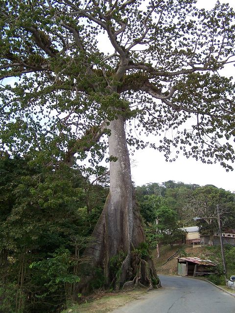 Zwischen King-Peters-Bay und Castara-Bay steht ein riesiger Baum mit gewaltigen Brettwurzeln direkt an der Straße. Es ist ein Silk-Cotton-Tree, ein Seiden-Baumwoll-Baum ist. Seine Früchte bilden eine Baumwolle aus, die weich und zart wie Seide ist. Dieser Baum hier ist zweihundert Jahre alt. Da es nicht mehr viele Bäume dieser Art gibt, sind sie geschützt.
