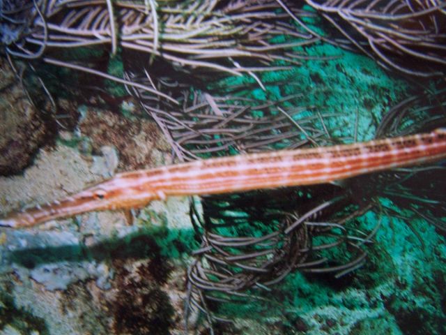 Mt. Irvine“ nördlich von Crown Point auf der karibischen Seite ist ein relativ flaches Riff mit Sandflächen zwischendurch. Ein paar Muränen, Kaiserfische, Feilenfische und ein schöner Igelfisch sowie ein Kofferfisch mit einem Trompetenfisch zusammen konnten wir beobachten. Als Neuheit entdeckte ich einen kleineren Trompetenfisch mit einem leuchtend blauen Streifen am Kopf. Später entnahm ich einem Buch, dass es sich dabei um einen Blaupunkt-Flötenfisch handelt. Außer mir hat ihn wohl keiner gesehen.