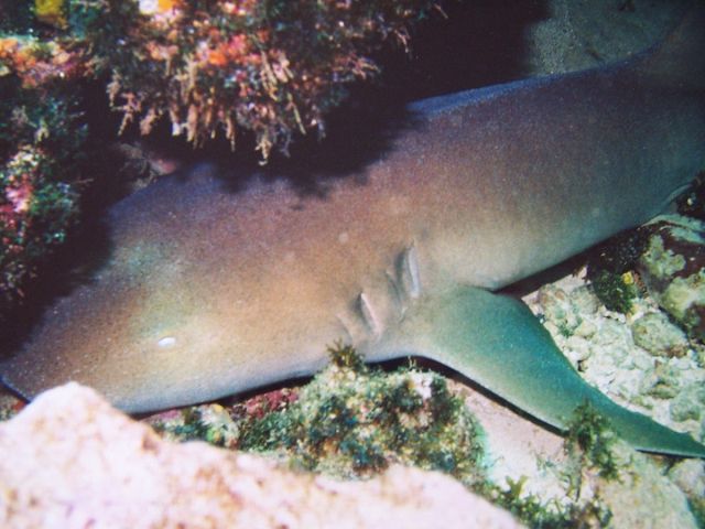 Der erste Tauchgang war noch recht entspannt. Wir sahen ein paar Ammenhaie und eine Schildkröte. Hier heißen die Karrettschildkröten Hakenschnabel-Schildkröten. Man findet sie in allen Meeren. Außerdem liegt dort ein großer alter Anker. Der ist schon so bewachsen, dass man ihn kaum noch erkennt. Man sieht nur, dass dieses Gebilde irgendwie nicht ganz in die Landschaft passt. Der zweite Tauchgang war dann ein Strömungstauchgang.