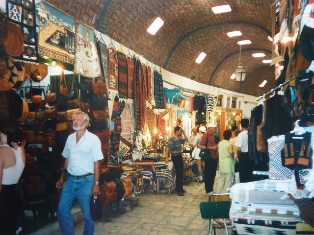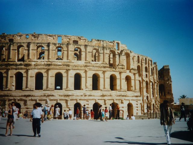 In El Jem mitten in Tunesien ist es heiß und die Stadt ist berühmt für ihr Kolosseum, das genau nach dem Vorbild des Kolosseums in Rom gebaut wurde. Damals hatte die Stadt ganze dreißigtausend Einwohner, heute ist sie ein Dorf. Das Kolosseum ist noch sehr gut erhalten und wirkt zwischen all den kleinen Häusern in der Stadtmitte gewaltig. Da man uns hier nur zwanzig Minuten Aufenthalt genehmigte, lohnte sich ein Besuch des Kolosseums nicht. Zu gern hätten wir es uns angesehen.