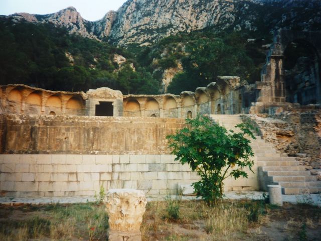 Die Anlage selbst zu finden war schon wesentlich schwieriger. Nach einigem Fragen standen wir vor dem Tempel, eigentlich eine halbwegs erhaltene, zum Teil rekonstruierte, aber nichts desto Trotz beeindruckende Ruine. Die Römer hatten hier vor einer fast eintausend Meter hohen Steilwand einen Tempel des Wassers gebaut. Doch vom Wasser keine Spur. Wir fanden bei unserer Erkundung heraus, dass die „Trampelpfade“ in die Berge eigentlich Wasserläufe sind, wenn denn einmal Wasser aus dem Berg kommt.